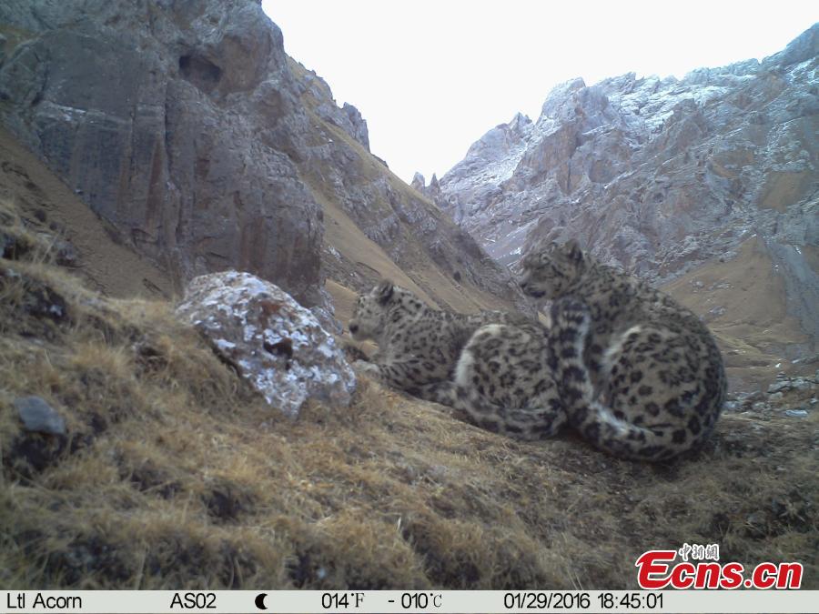 An image taken by an infrared camera shows two snow leopards mating at the Lancang River Source Zone in Yushu Tibet Autonomous Prefecture, Northwest China’s Qinghai Province. A biodiversity survey found at least 13 snow leopards and three leopards in an area of around 300 square kilometers and also captured rare images of many other wild animals. (Photo provided by Shan Shui Conservation Center Center)