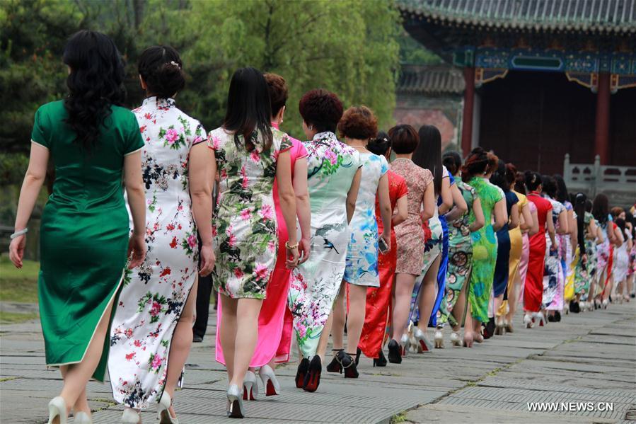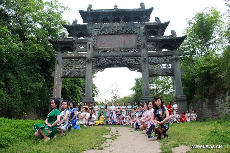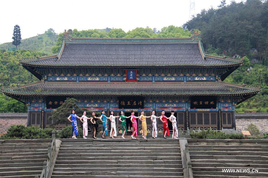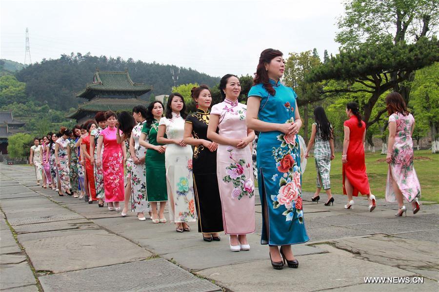 Cheongsam lovers display cheongsams on the Wudang Mountain in Shiyan, central China's Hubei Province, April 23, 2016. (Xinhua/Cao Zhonghong)