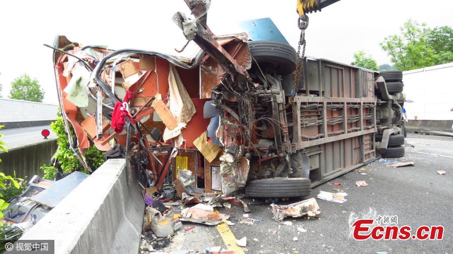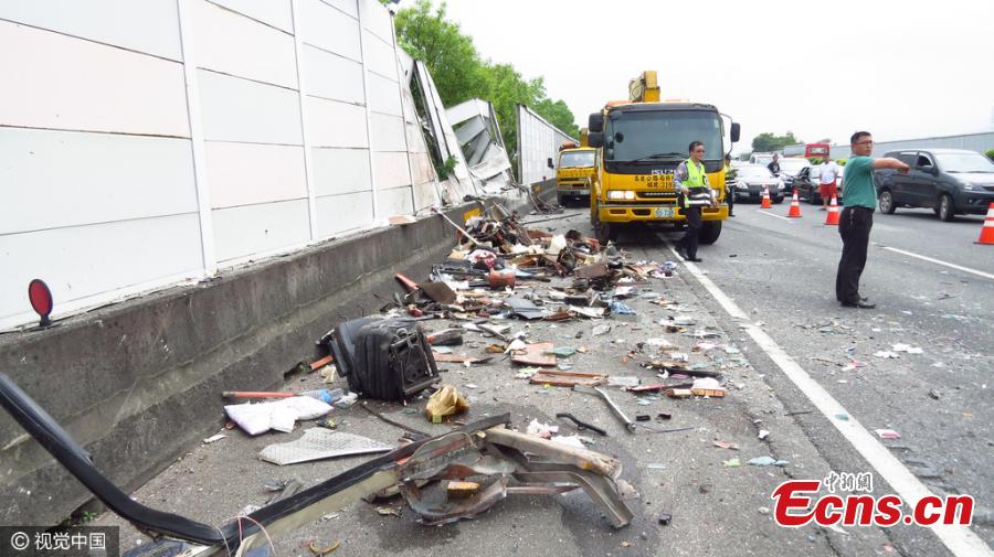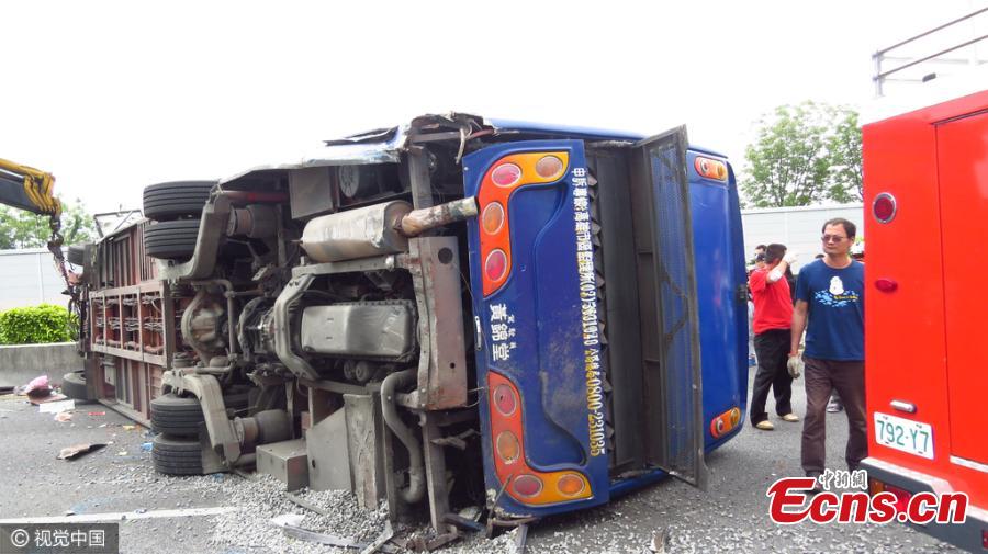 A bus carrying mainland tourists collides with a gravel truck on a highway section in Miaoli County, Taiwan, April 25, 2016. The bus driver died and more than 20 were injured in the accident. (Photo/CFP)