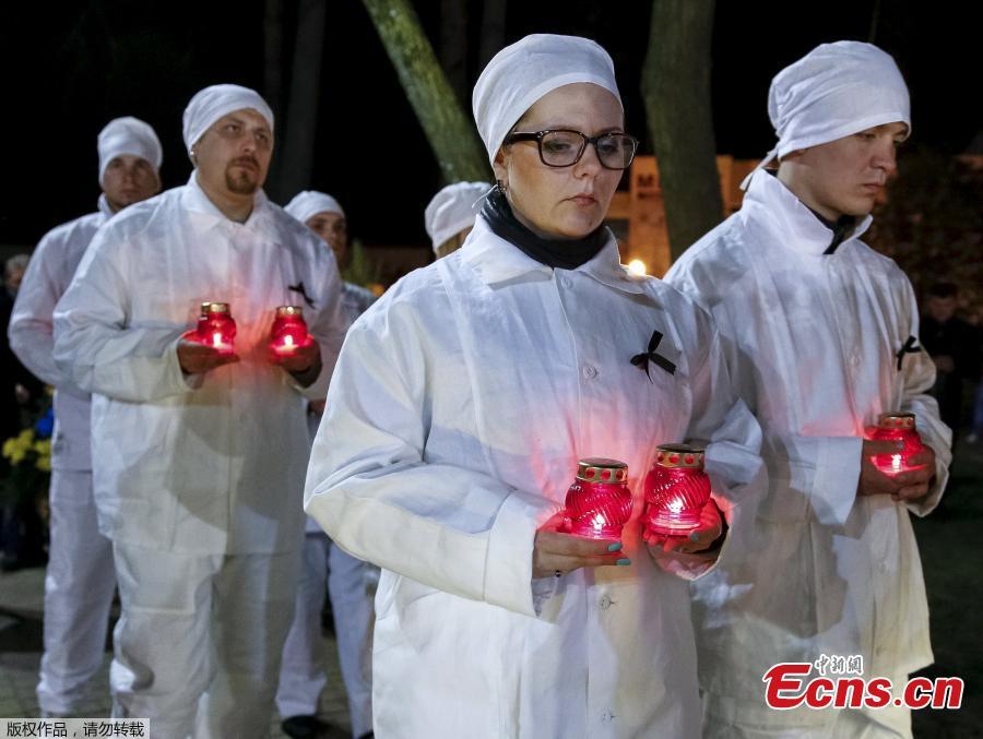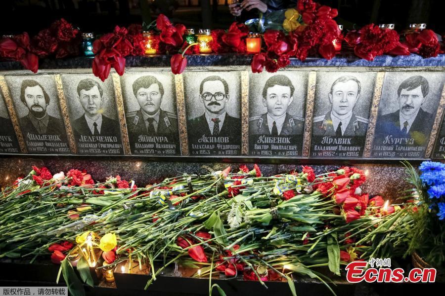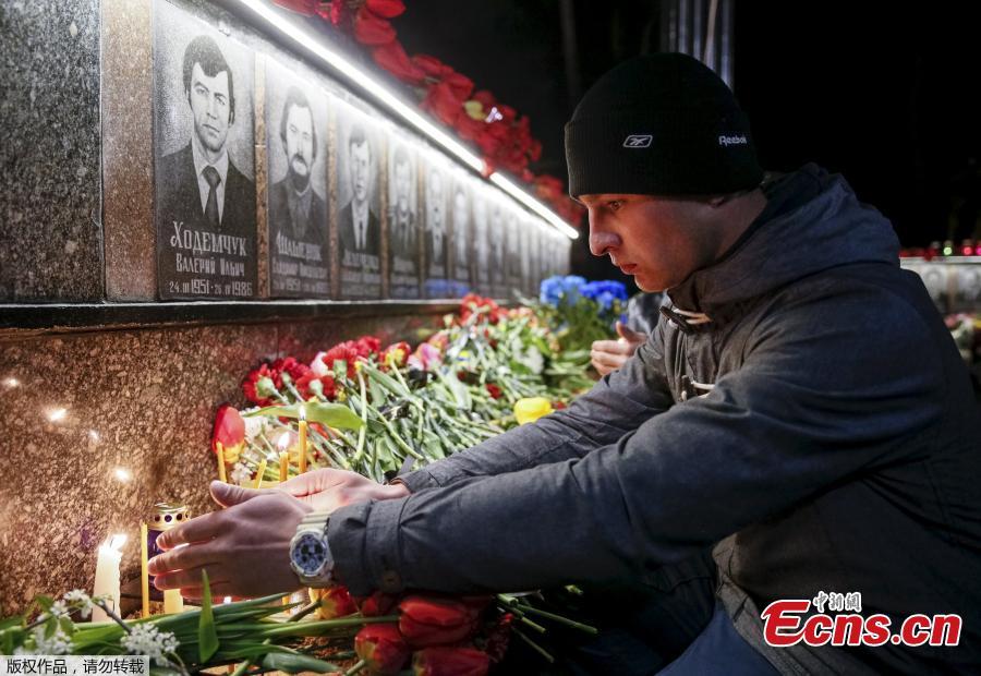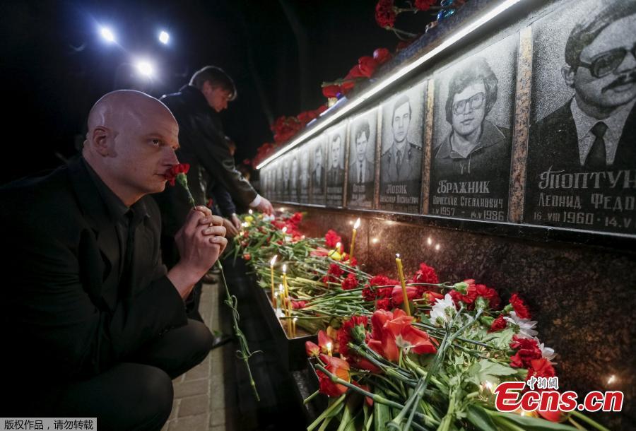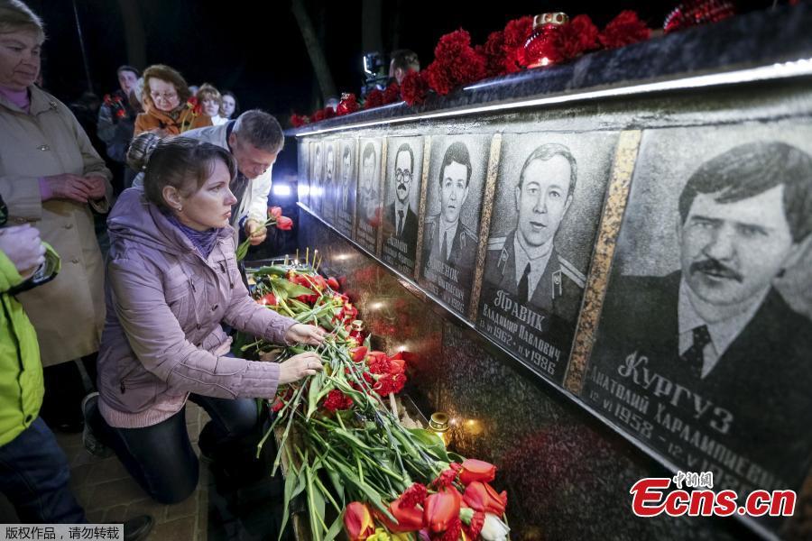 A woman lays flowers at a memorial, dedicated to firefighters and workers who died after the Chernobyl nuclear disaster, during a night service in the city of Slavutych, Ukraine, April 26, 2016. (Photo/Agencies)