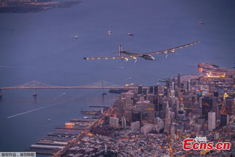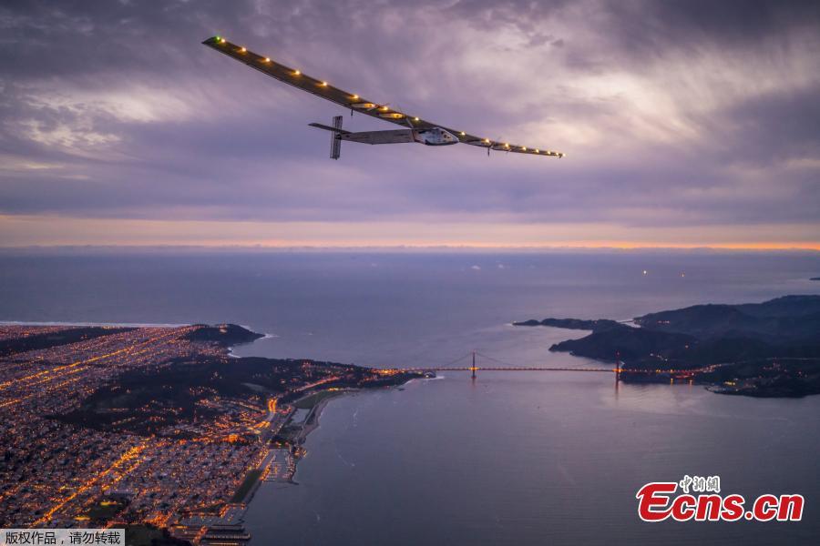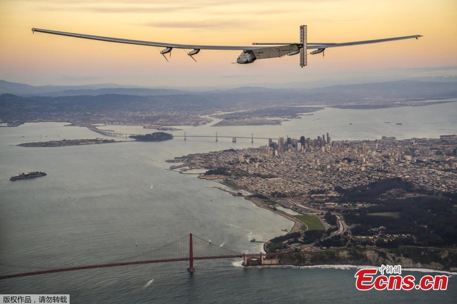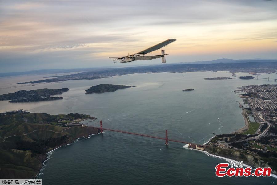 "Solar Impulse 2", a solar-powered plane piloted by Bertrand Piccard of Switzerland, flies over the Golden Gate bridge in San Francisco, California, U.S. April 23, 2016, before landing on Moffett Airfield following a 62-hour flight from Hawaii.(Photo/Agencies)