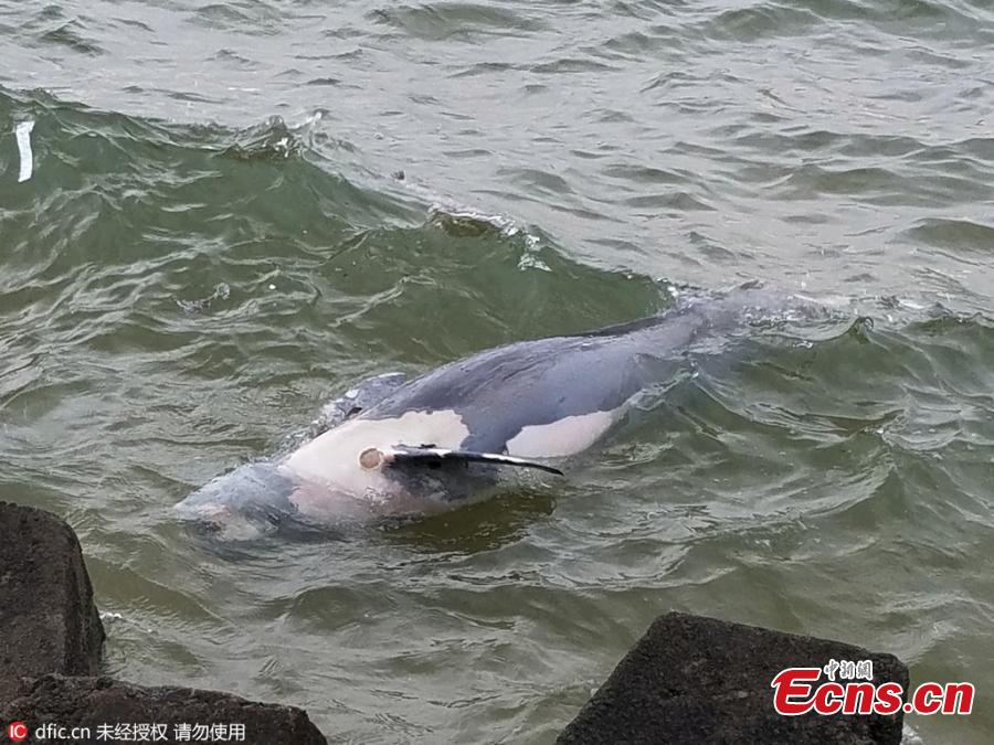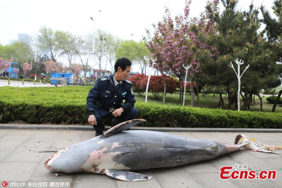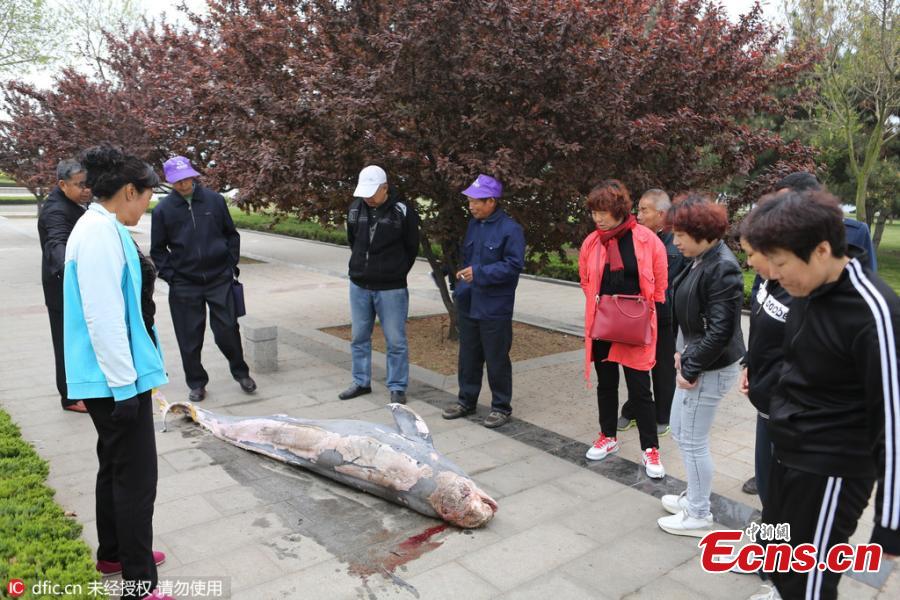 A dead dolphin is found washed ashore in Rizhao city of East China’s Shandong Province, April 26, 2016. It remains unclear what caused the death of the sea mammal, which was about 2.5 meters long and weighed about 100 kilograms. Dolphins are under second-class animal protection in China. (Photo/IC)