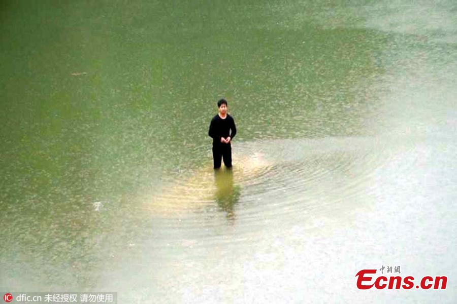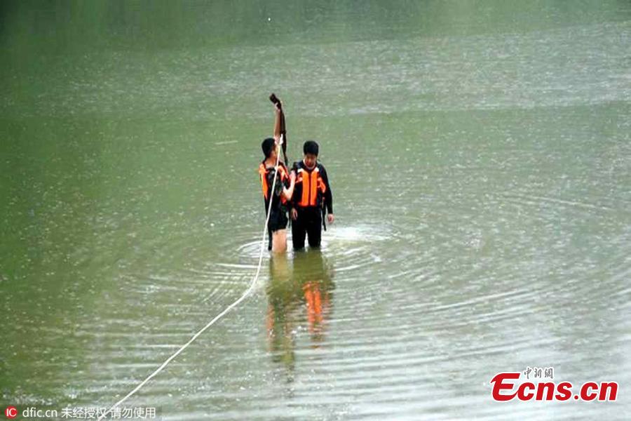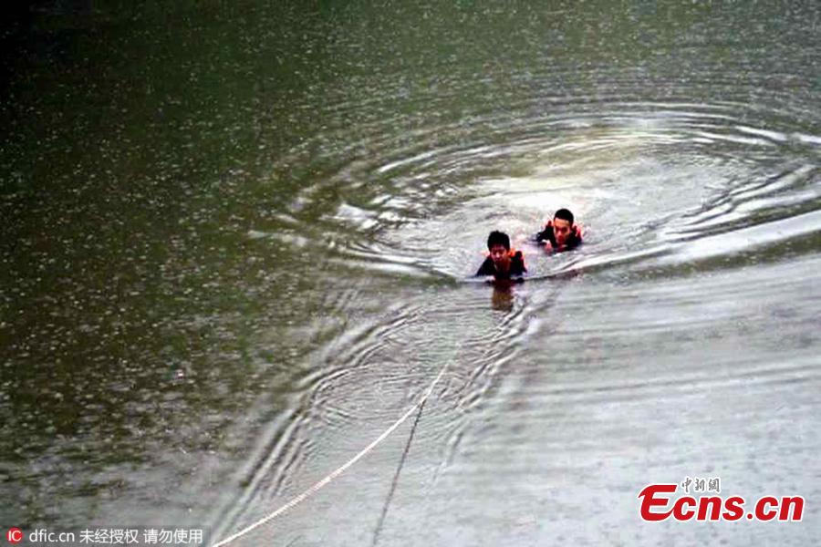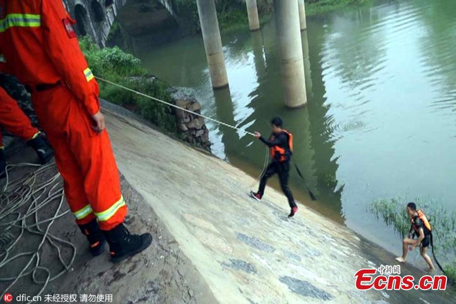 A driver waits for rescuers after his car sinks into a river in Dongzhi County, East China’s Anhui Province, April 26, 2016. The driver lost control of the car, which knocked down a barrier and crashed into the river. (Photo/IC)