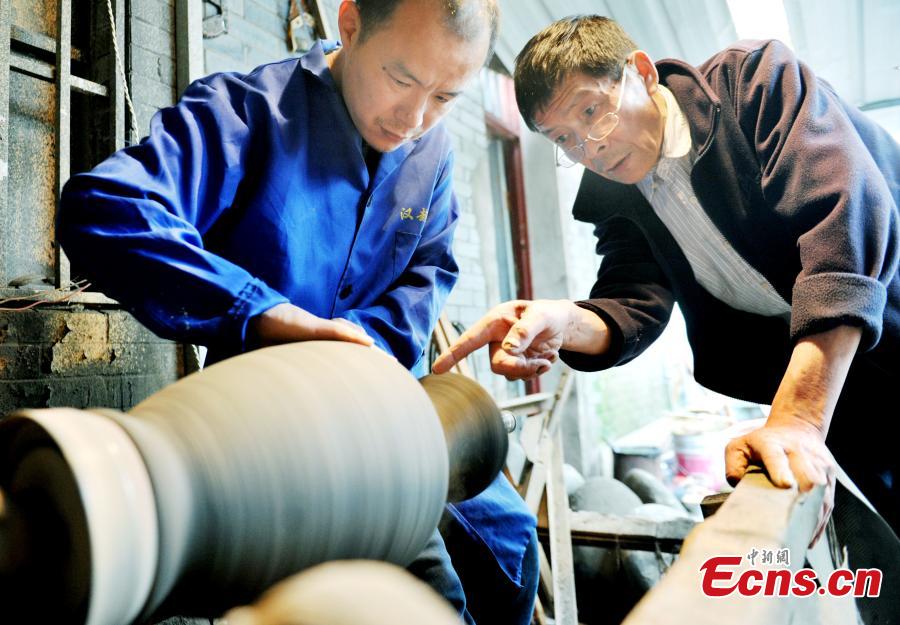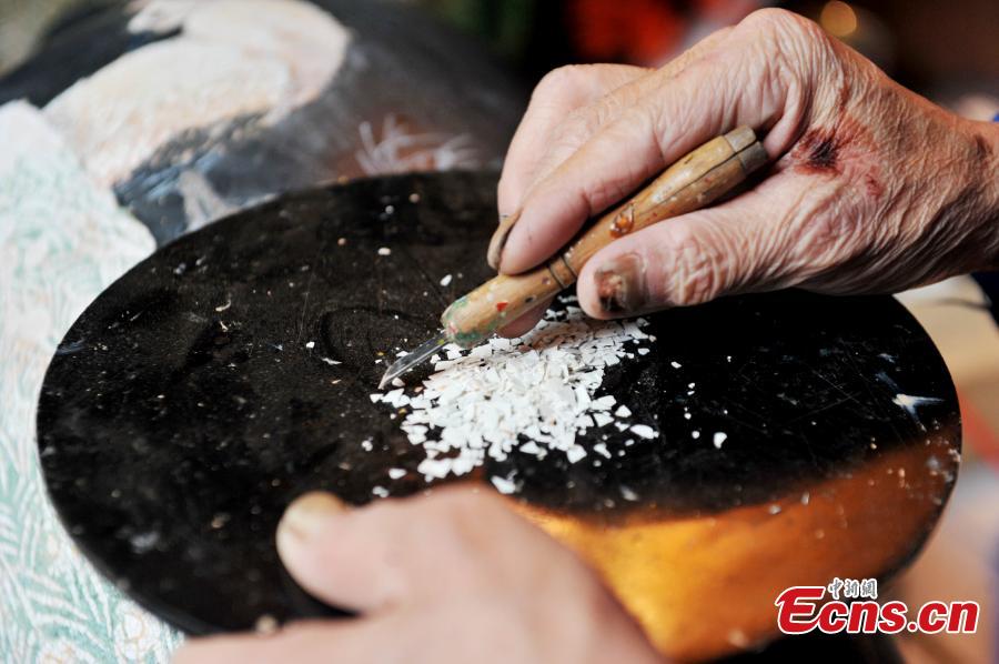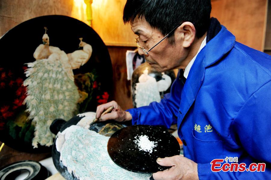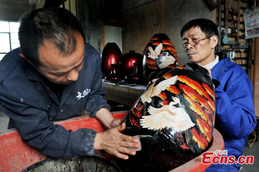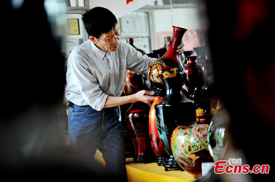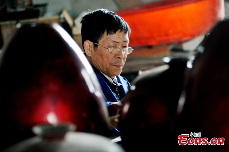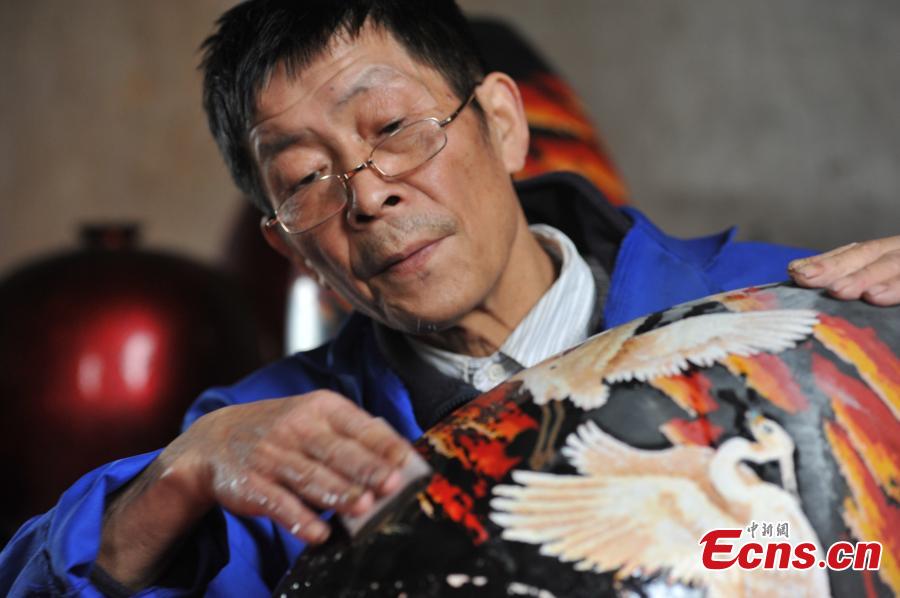 Li Bosheng, a master of bodiless lacquerware, works in a studio in Poyang County of East China's Jiangxi Province. Li began to learn the craft from his father 40 years ago and is the only province-recognized craftsman of the National Intangible Cultural Heritage in Jiangxi. This unique craft is considered among China's great folk art treasures along with Jingdezhen porcelain and cloisonné from Beijing. The creation of bodiless lacquerware begins with a clay, plastic or wooden mold with raw lacquer used as glue for layers of ramie or silk. After it has dried, the ware is removed and finished with polishing, carving and embellishing. Although he has won a number of awards at home and abroad, Li said the craft faces a worrying decline due to its time-consuming production and technical requirements. Despite governmental support, few younger people are willing to learn and inherit the craft. (Photo: China News Service/Zhuo Zhongwei)
