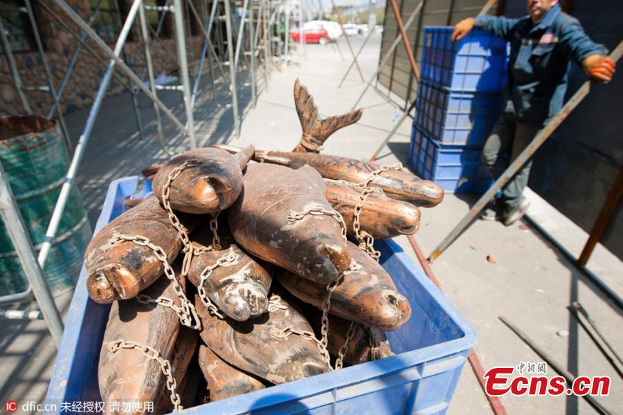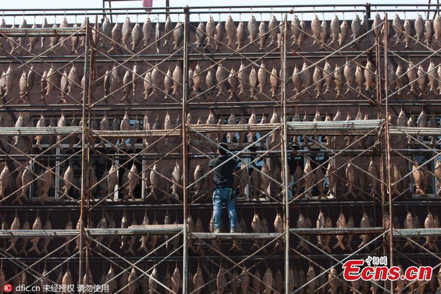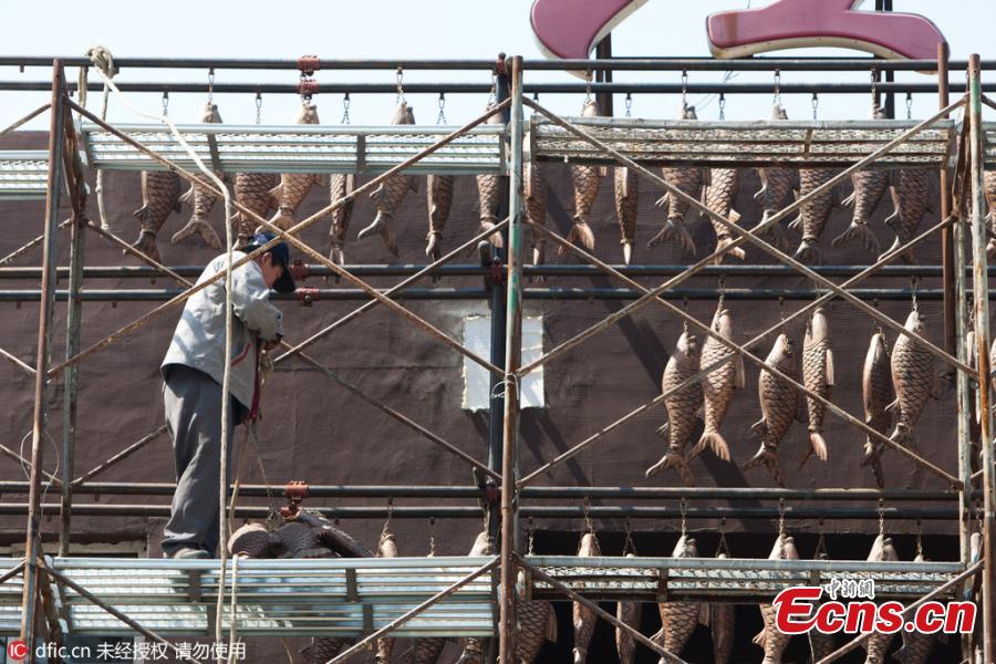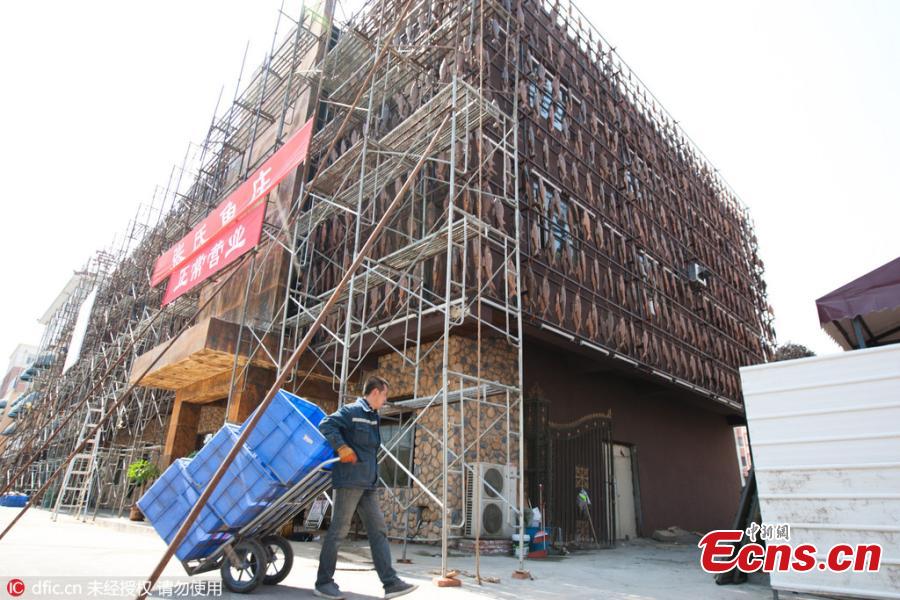 A restaurant is decorated with fish models hanging from the building's exterior walls in Changchun City, Northeast China’s Jilin Province, April 27, 2016. The restaurant plans to use about 50,000 fish models made with similar materials for car steering wheels. (Photo/IC)