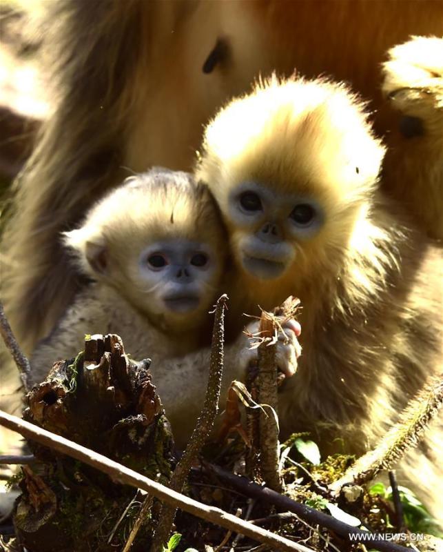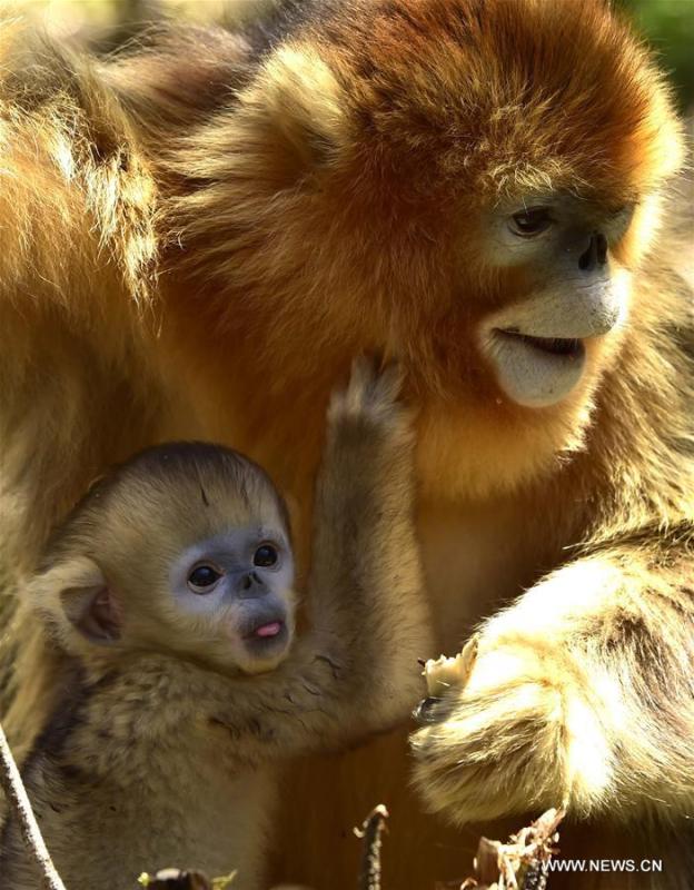 Golden monkeys play with a new-born baby at Dalongtan Golden Monkey Research Center in Shennongjia, central China's Hubei Province, April 28, 2016. The number of golden monkeys in Shennongjia has doubled since the 1980s thanks to the environmental protection. (Photo: Xinhua/Du Huaju)