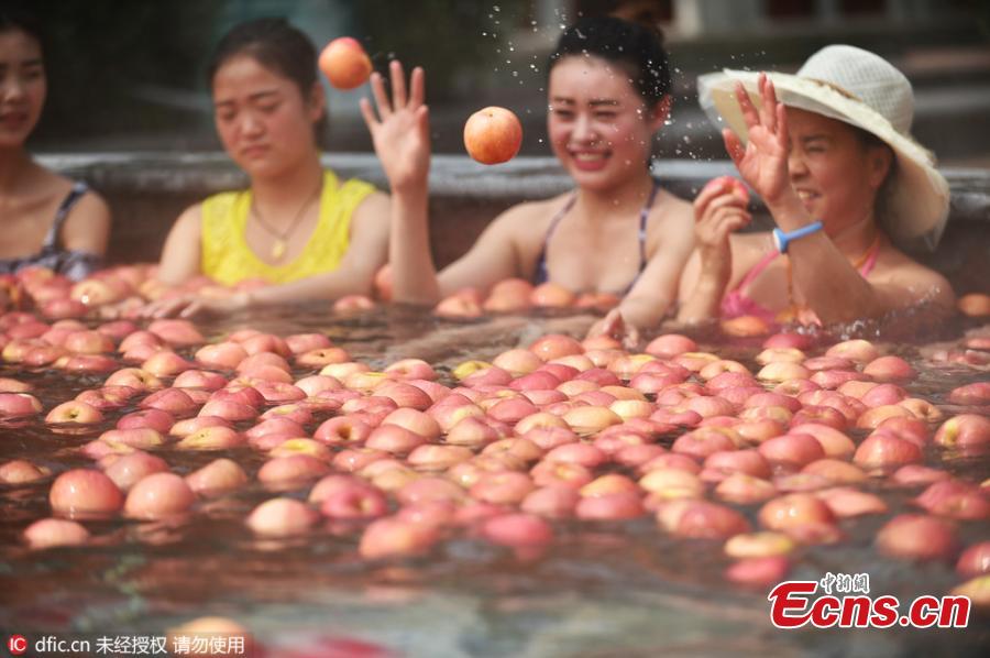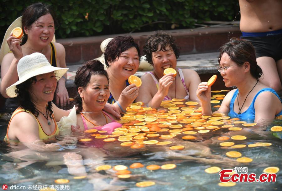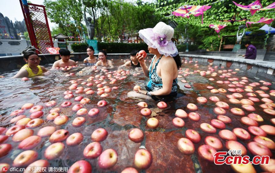 Tourists enjoy themselves at a hot spring resort in Luoyang City, Central China’s Henan Province, April 28, 2016. To attract tourists during the May Day holiday, the resort put apples, lemons, oranges and cucumbers into the water, saying they can provide a better experience for bathers. (Photo/IC)