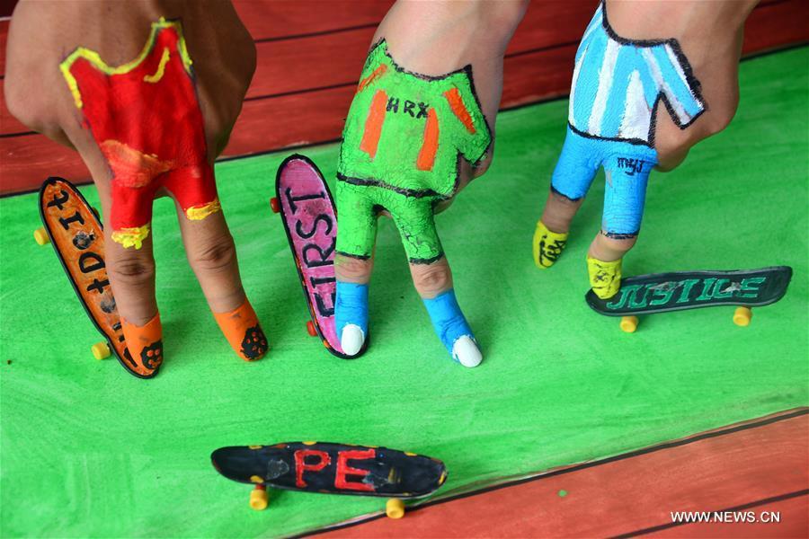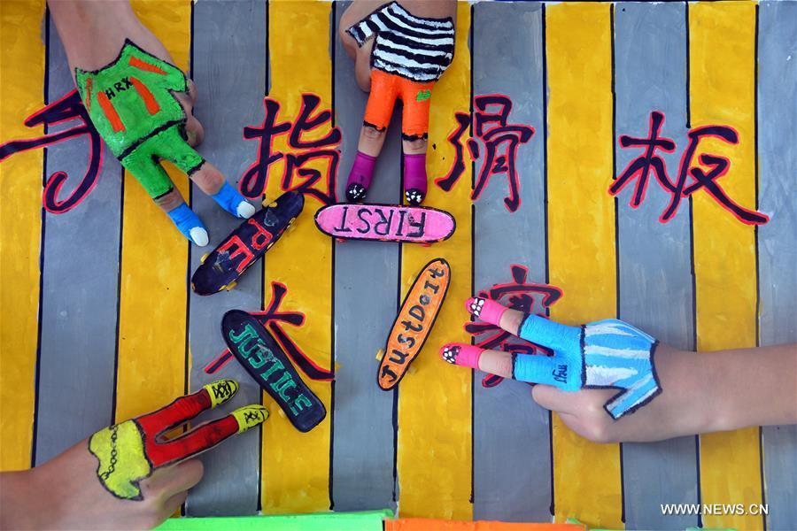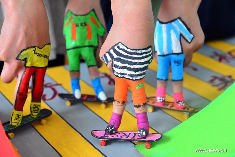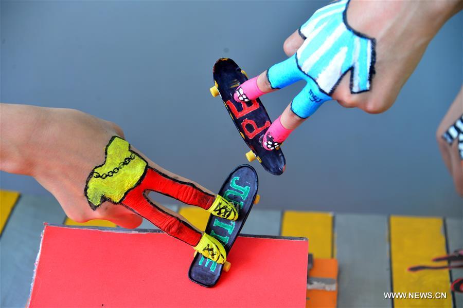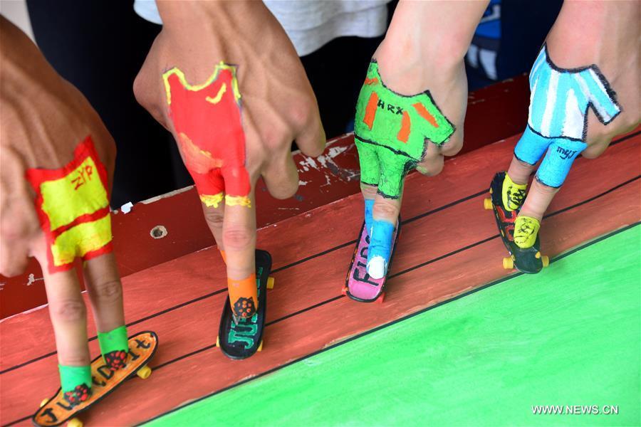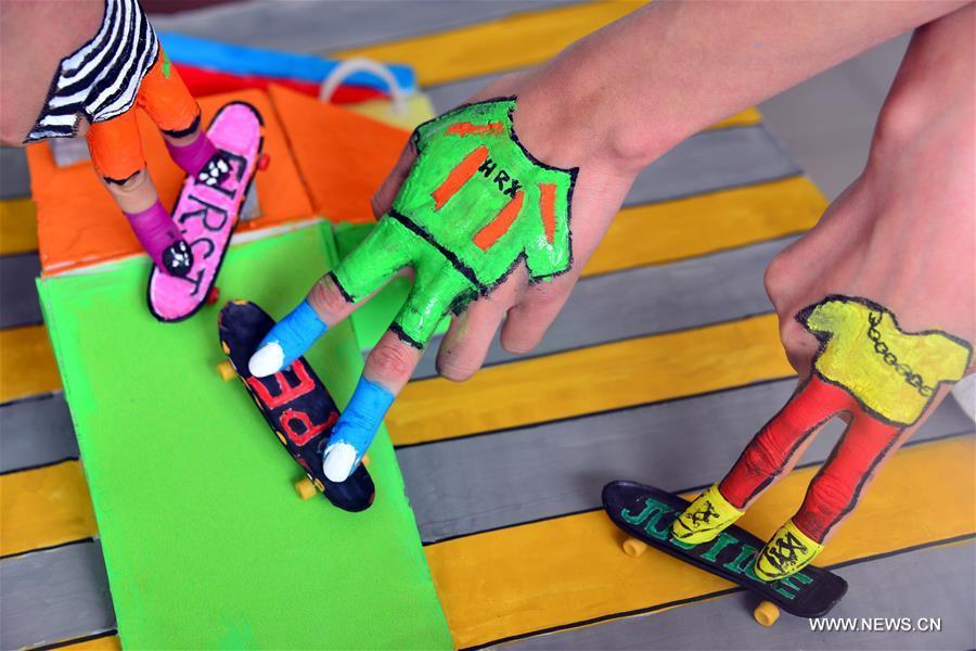 Students take part in a finger skateboard match at the School of Physical Education of the Liaocheng University in Liaocheng City, east China's Shandong Province, April 28, 2016. (Photo: Xinhua/Zhao Yuguo)