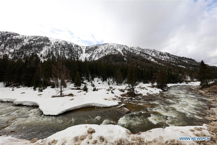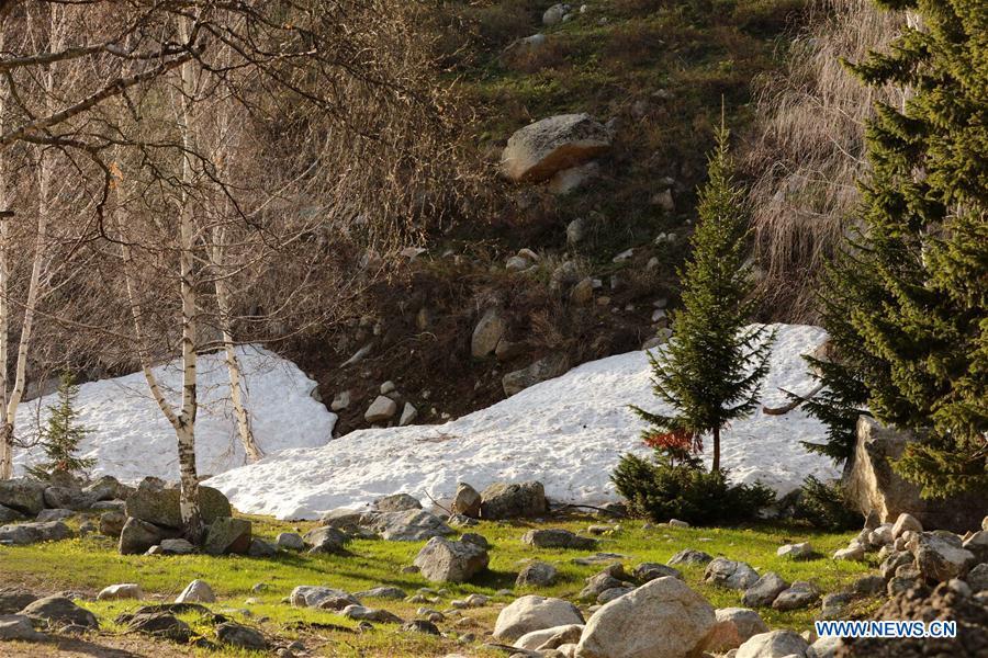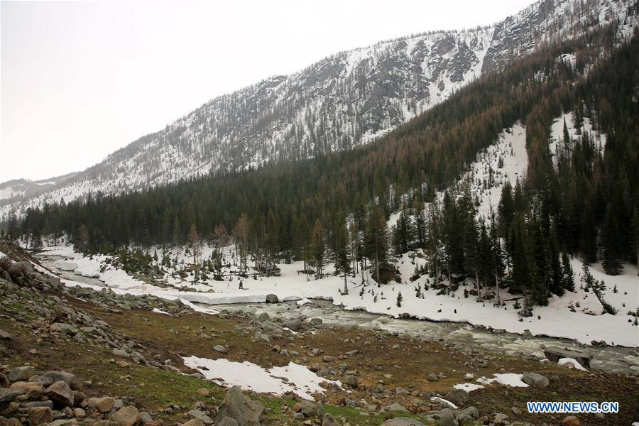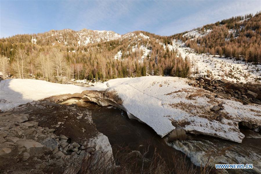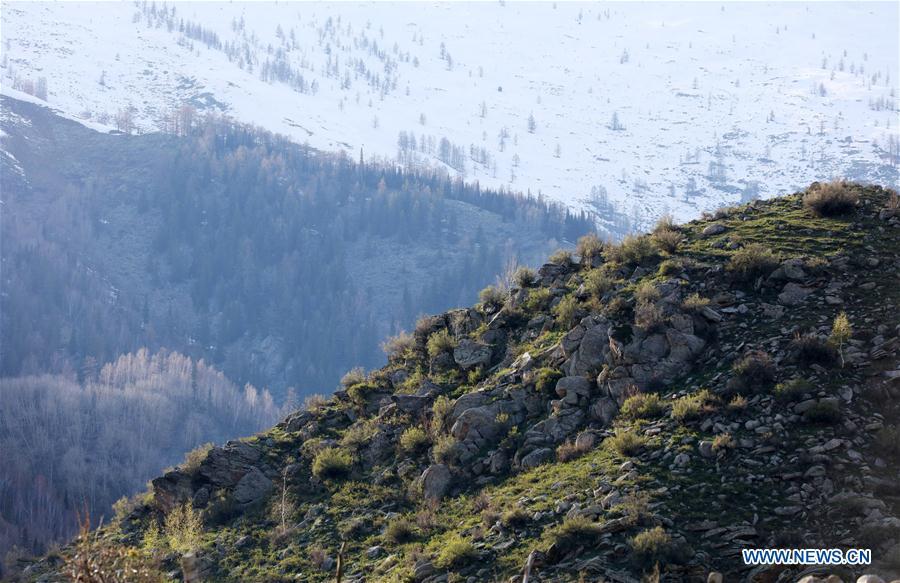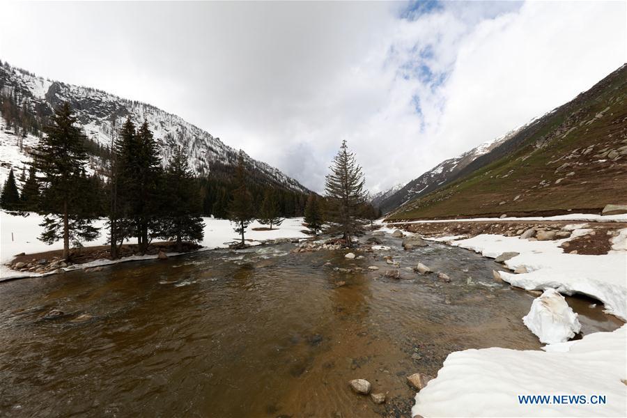 Photo taken on April 27, 2016 shows the spring scenery at Kiran valley in Altay, northwest China's Xinjiang Uygur Autonomous Region. Snow on the valley begins to melt as the temperature rises here. (Photo: Xinhua/Ye Erjiang)