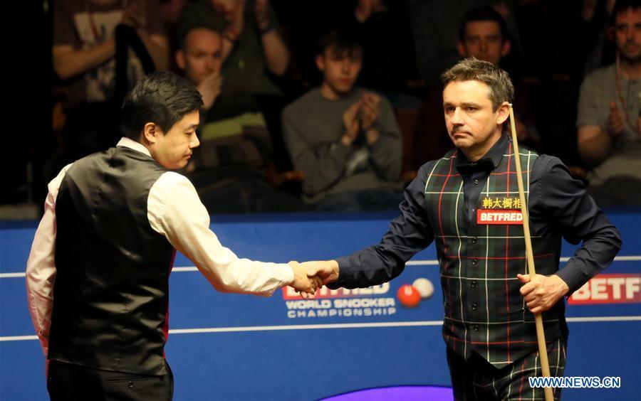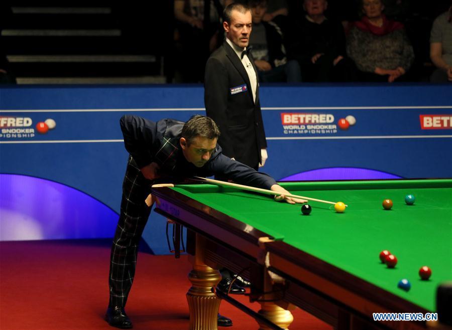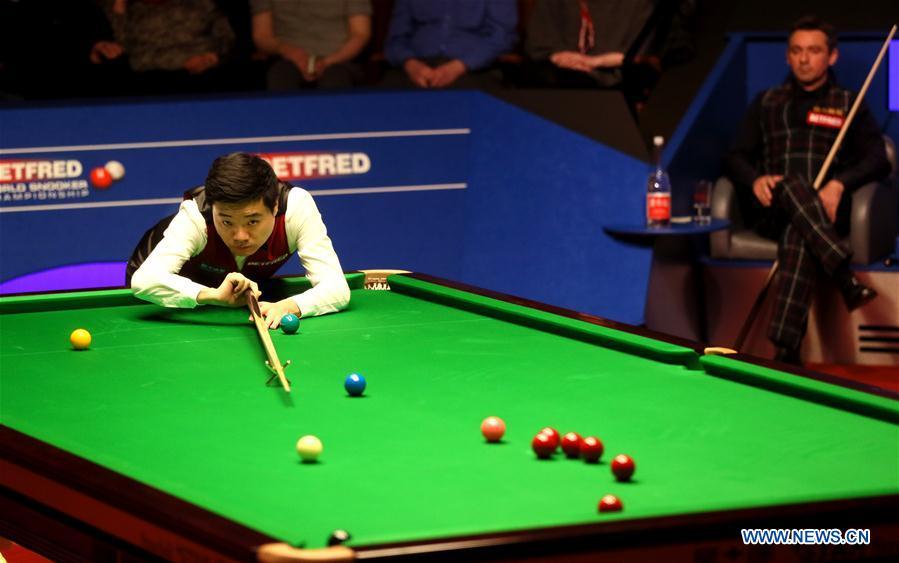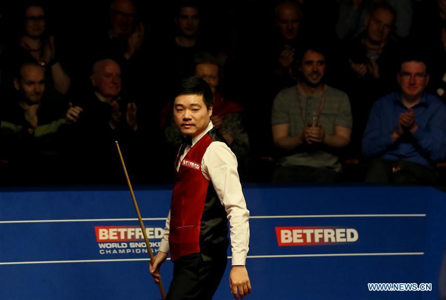 Ding Junhui of China competes during the third session of the semifinal with Alan McManus of Scotland at the World Snooker Championship 2016 at the Crucible Theatre in Sheffield, England on April 29, 2016. Ding led 14-10 after the third session. Ding Junhui equalled the record for centuries scored by one player in a World Championship match as his sixth ton helped build a 14-10 lead over Alan McManus in an enthralling semifinal.The pair set a new record of nine tons in a World Championship match. (Photo: Xinhua/Han Yan)
