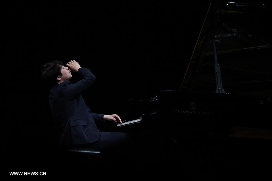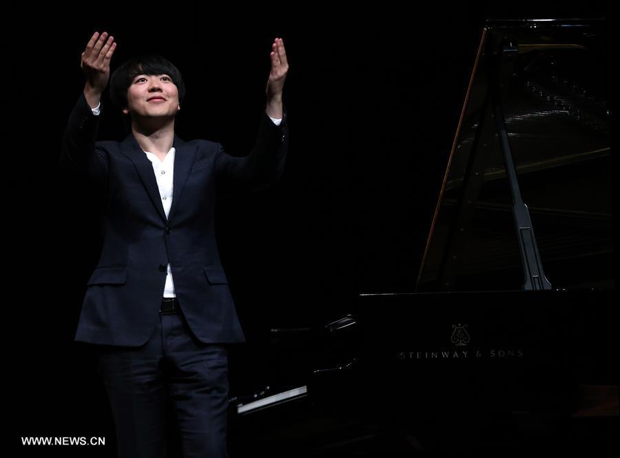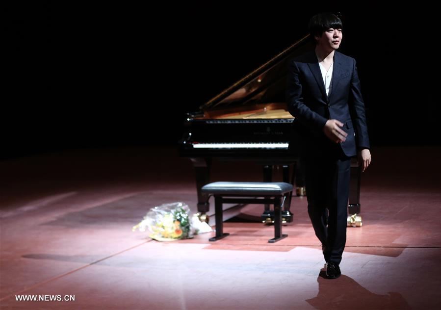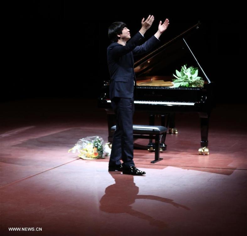 Chinese Pianist Lang Lang greets the audience after his performance at the Old Opera House in Frankfurt, Germany, on April 30, 2016. (Xinhua/Luo Huanhuan)