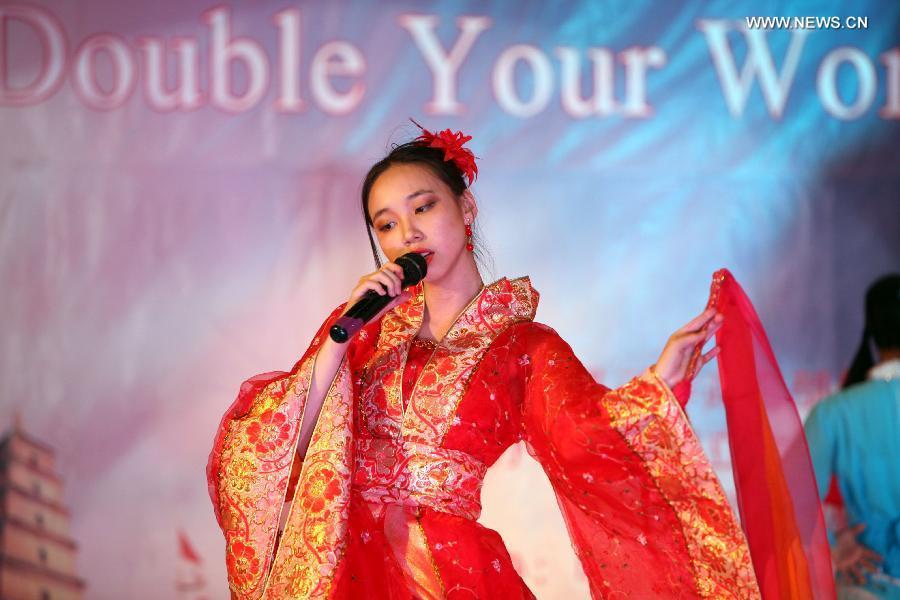 A contestant takes part in the 9th Chinese Bridge Final Competition for non-Chinese middle school students of Mongolia district in Ulan Bator, the Mongolia on April 30, 2016. A total of 15 competitors took part in the Mandarin-speaking competition on Saturday.(Xinhua/Zheng Chuang)