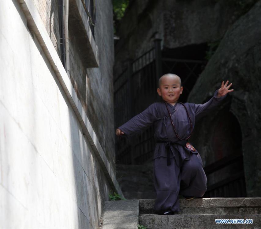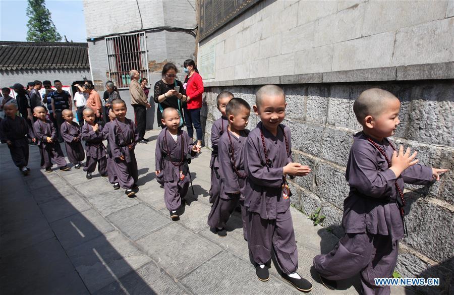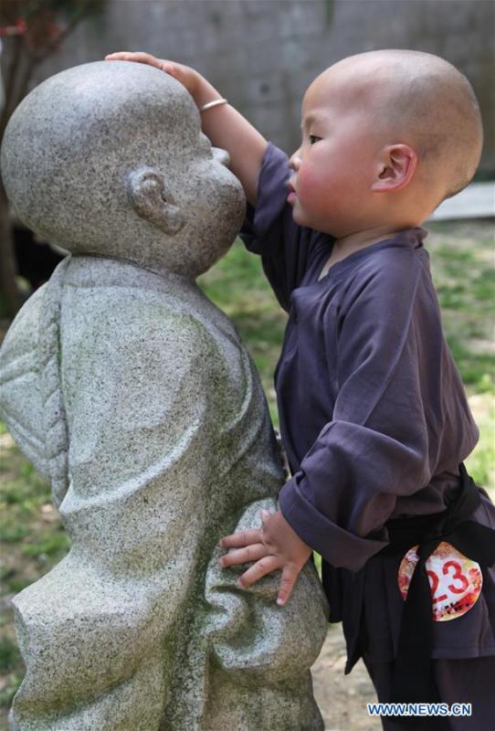 Kids wearing Buddhist clothing take part in an event of " finding the most lovely Buddhist baby" at the Qixia Mountain scenic spot in Nanjing, capital of east China's Jiangsu Province, May 1, 2016. The most lovely Buddhist baby will be voted by netizens from a total of 50 kids at the age of 3 to 5, who walked around a Buddhist pagoda, stringed Buddhist beads and tasted Buddhist cuisine in the event on May 1. (Photo: Xinhua/Li Wenbao)