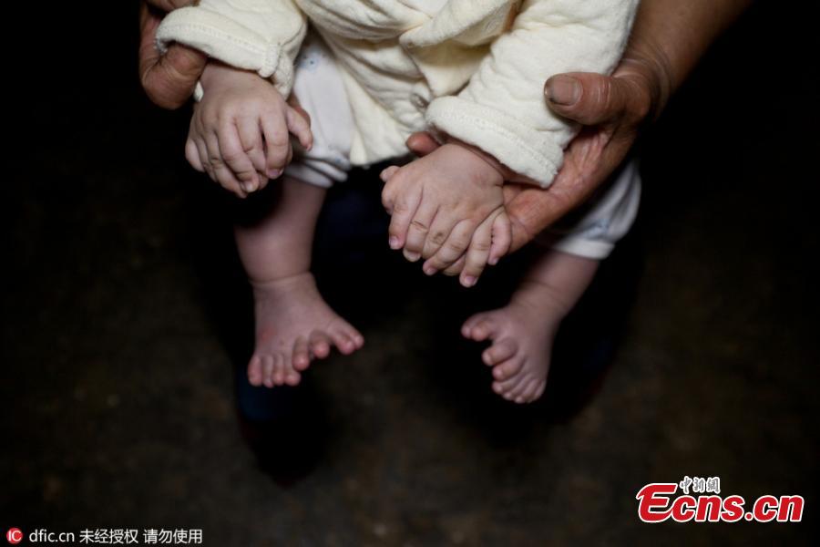A three-month-old infant is diagnosed with polydactyly, a kind of birth defect with supernumerary fingers and toes, in Pingjiang County, Central China’s Hunan Province, May 1, 2016. The infant has 31 fingers and toes in total. (Photo/IC)