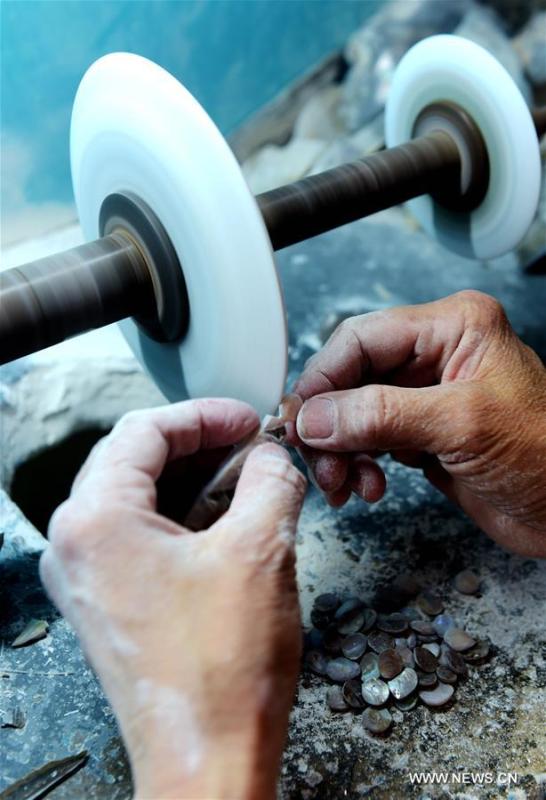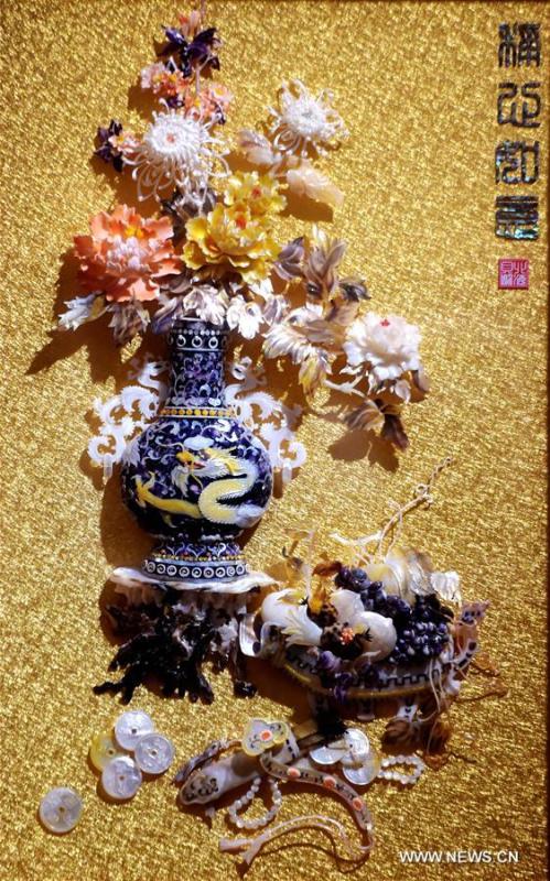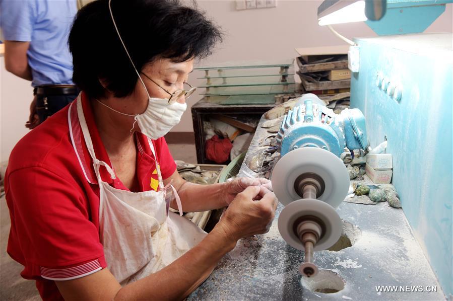 Carving craft master Shi Yexiu carves shells at a museum in Beihai, south China's Guangxi Zhuang Autonomous Region, May 3, 2016. Local workers have used skills of Chinese painting and embroidery in the process of shell carving in recent years. (Photo: Xinhua/Zhang Ailin)
