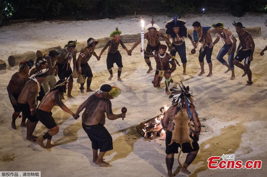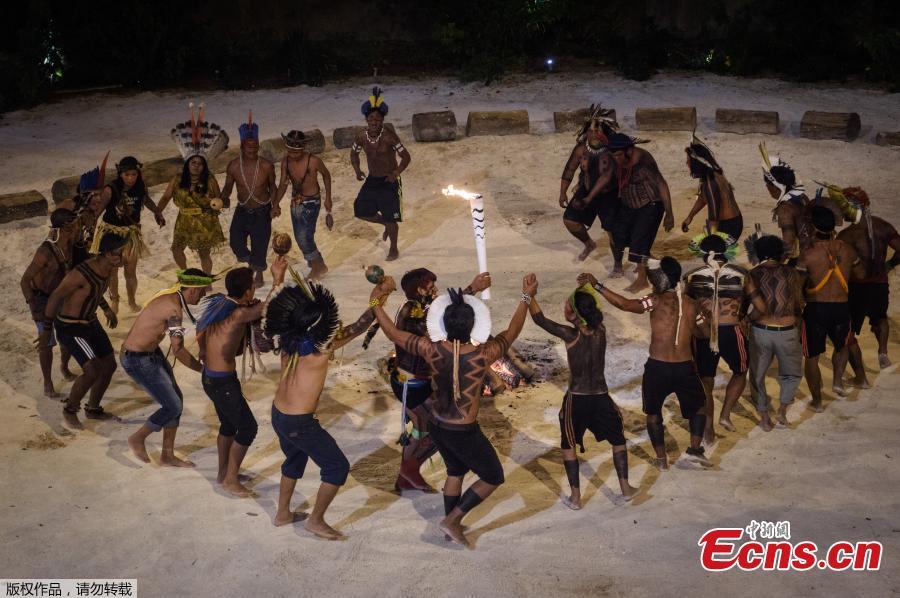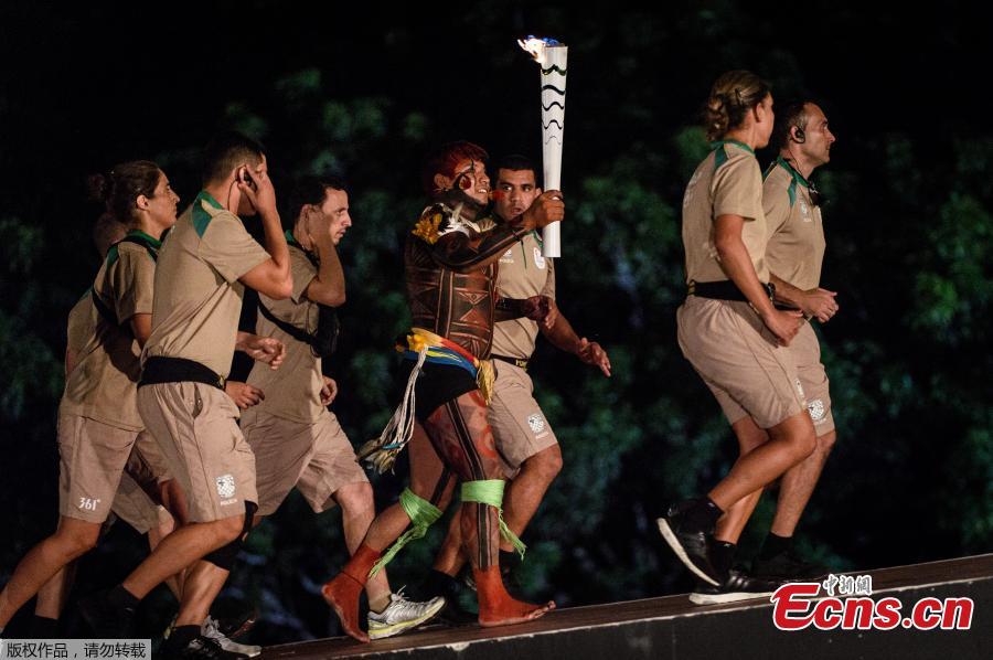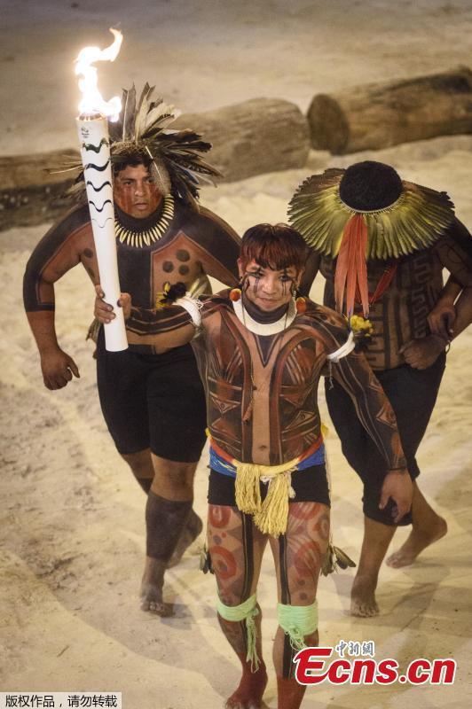 Brazilian indigenous athlete Kamukaika Lappa Yawalapiti carries the Olympic Torch and during a private ceremony at the Indigenous People’s Memorial in Brasilia on May 3, 2016. Embattled President Dilma Rousseff greeted the Olympic flame in Brazil on Tuesday, promising not to allow a raging political crisis, which could see her suspended within days, to spoil the Rio Games. The torch will now be carried in a relay by 12,000 people through 329 cities, ending in Rio's Maracana stadium on August 5 for the opening ceremony.(Photo/Agencies)
