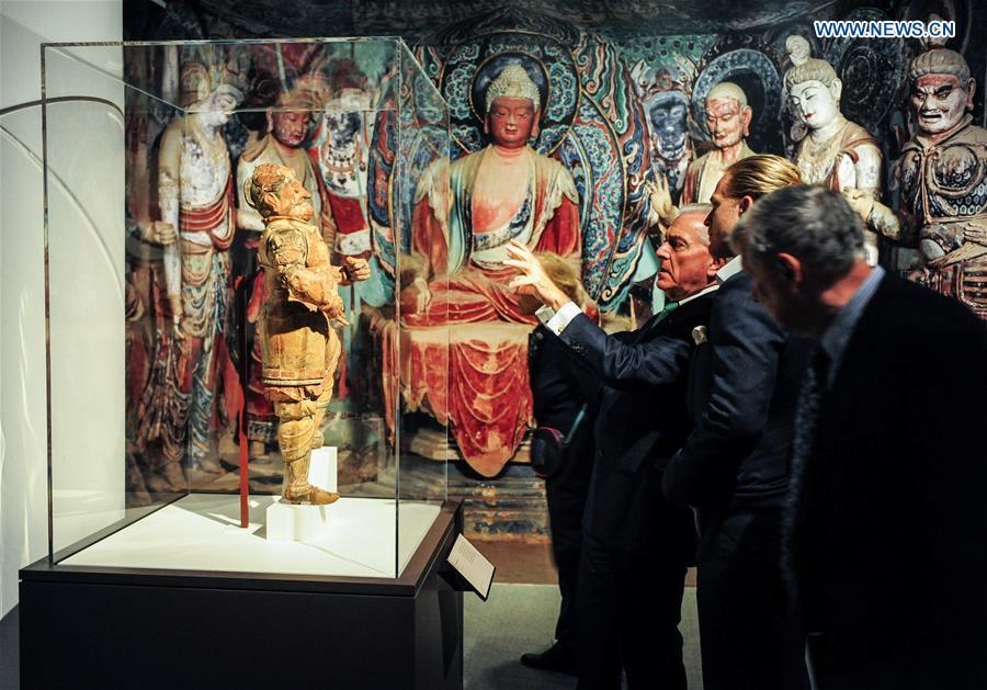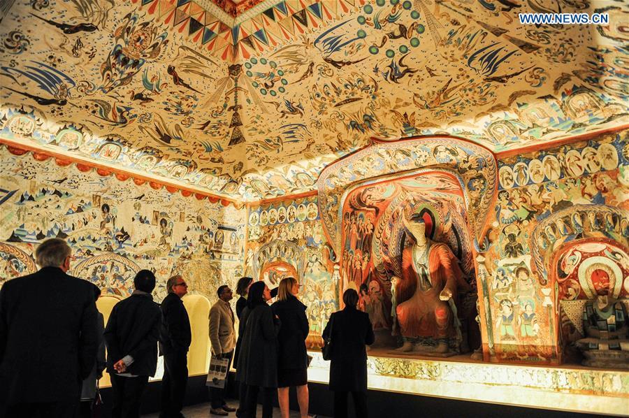 Photo taken on May 6, 2016 shows the "Cave Temples of Dunhuang: Buddhist Art on China's Silk Road" exhibition at Getty Center in Los Angeles, the United States. The exhibition "Cave Temples of Dunhuang: Buddhist Art on China's Silk Road" opened to public on Saturday. The exhibition will last until September, offering visitors the chance to learn about the art and history of the Mogao Grottoes, which thrived as a Buddhist center in China from the 4th to the 14th centuries. (Xinhua/Zhao Chaoqun)