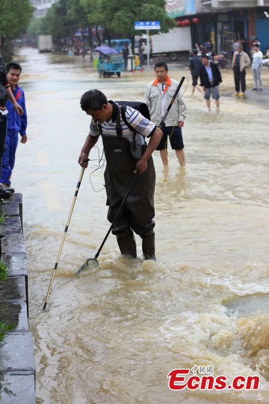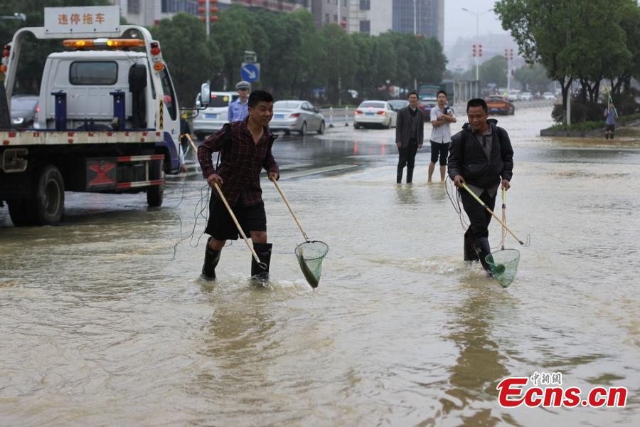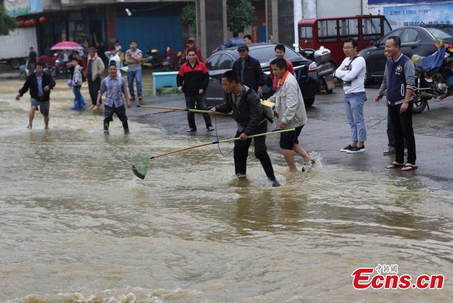 Residents catch fish on a flooded street after heavy rainfall in Daoxian County, Yongzhou City, Central China’s Hunan Province, May 8, 2016. The flood inundated some fields and fish farms. (Photo: China News Service/He Hongfu)