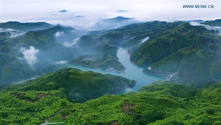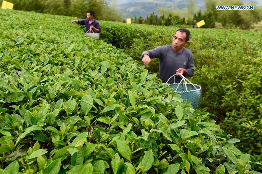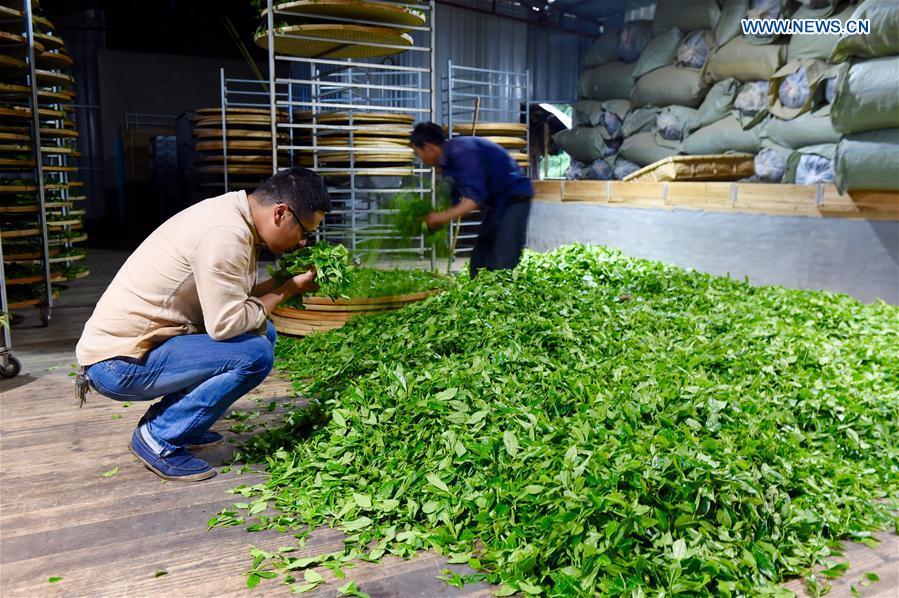 Tea farmer Wu Zhijian (L) checks the tea leaves at a tea plantation in Fuding, southeast China's Fujian Province, May 8, 2016. (Xinhua/Jiang Kehong)