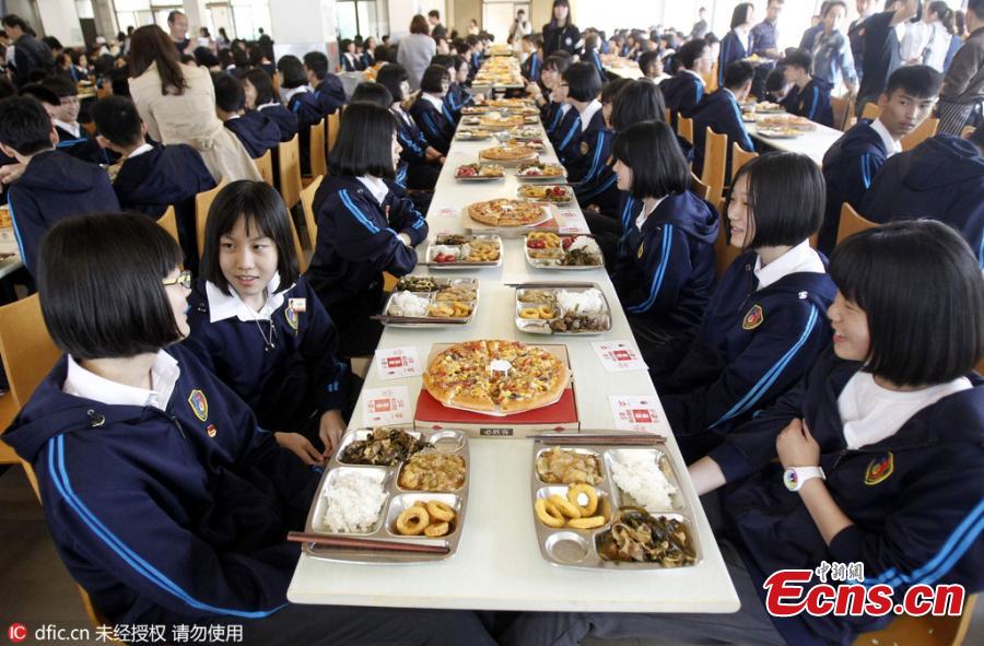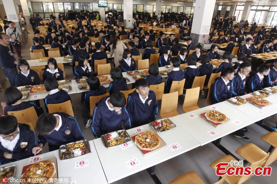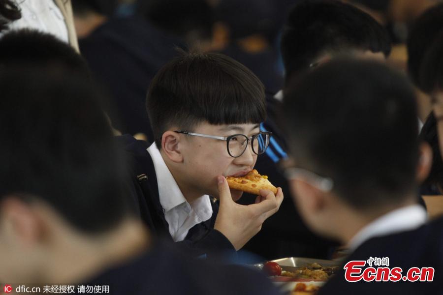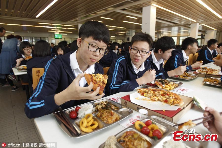 Senior-year students share pizza in the dining room at a junior high school in Zhengzhou City, the capital of Central China’s Henan Province, May 9, 2016. The former headmaster of the school ordered more than 150 pizza for some 600 students as a way of wishing them luck in their upcoming senior high school tests. (Photo/IC)