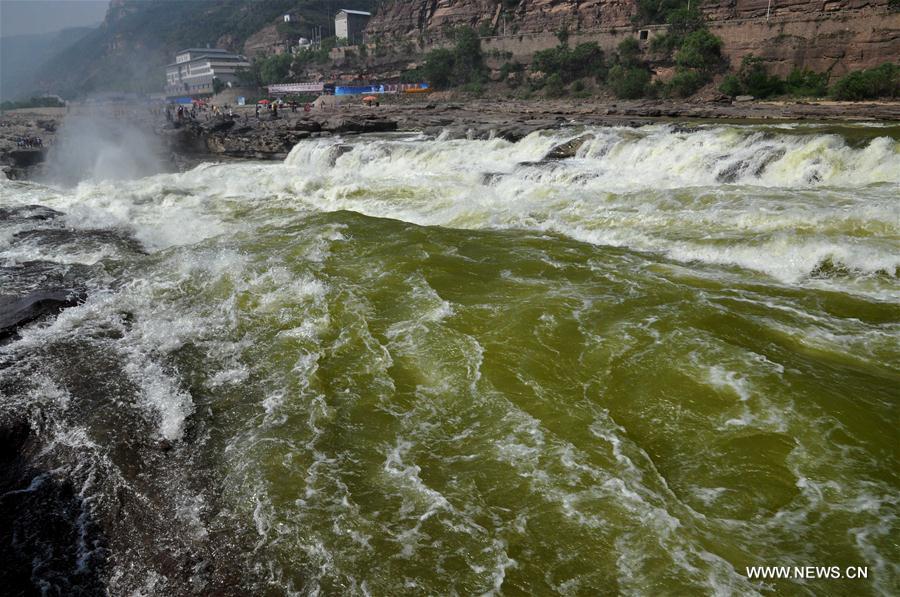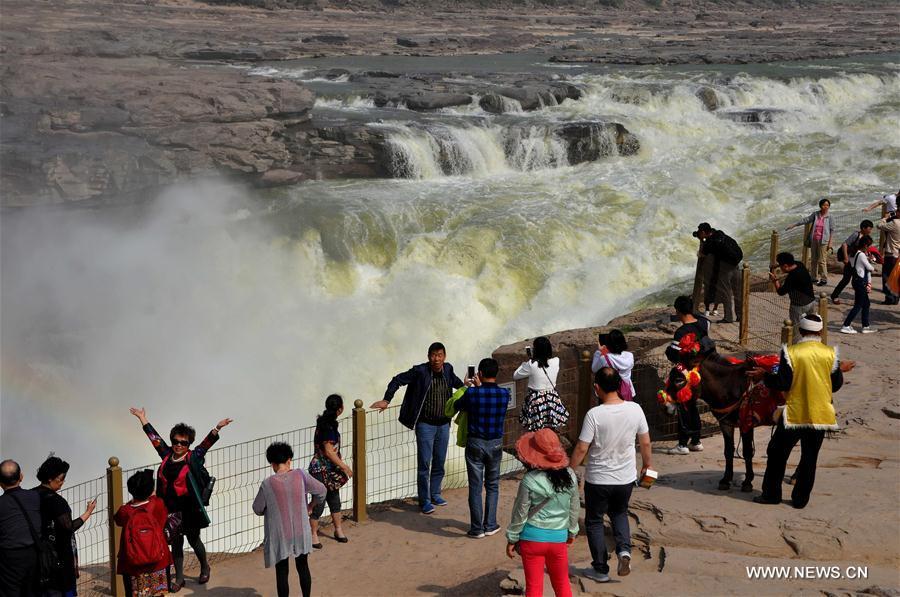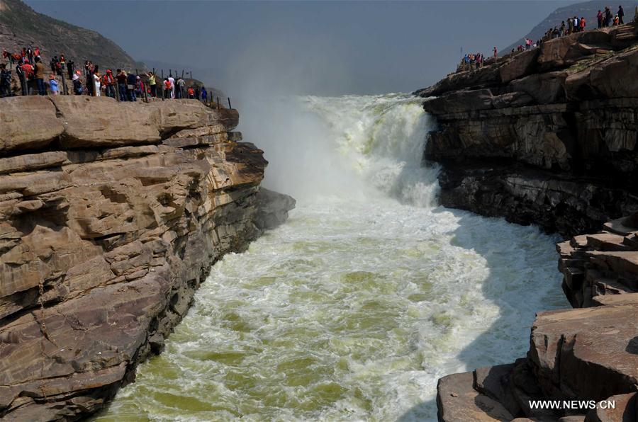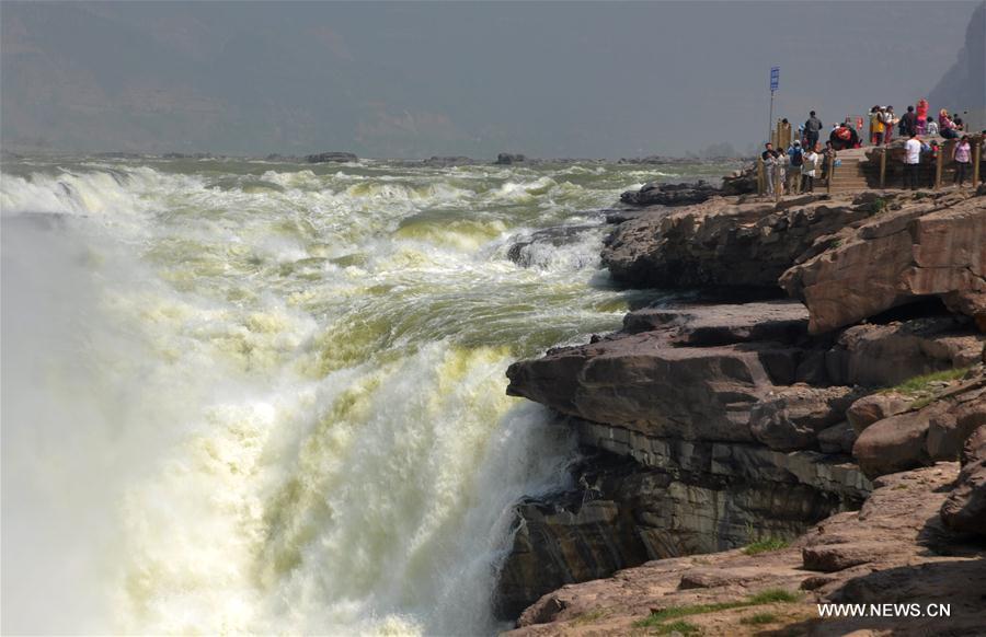 Photo taken on May 10, 2016 shows the Hukou waterfall on the Yellow River on the Shanxi-Shaanxi border in north China. Due to the reduce of rainfall on the upper reaches and the decrease of water from the main stream of the Yellow River since later April, the Hukou Waterfall has become unusually clear. (Xinhua/Lyu Guiming)