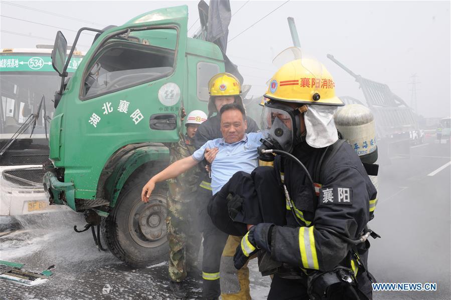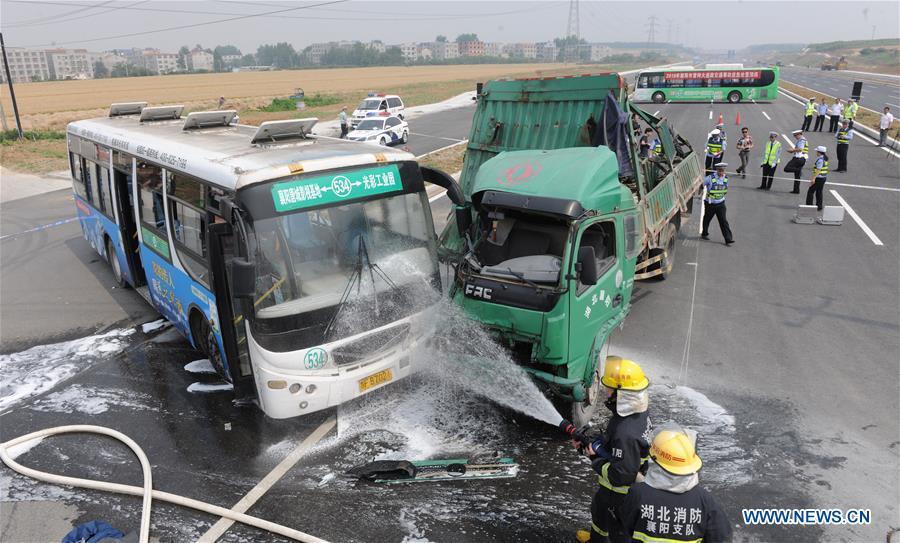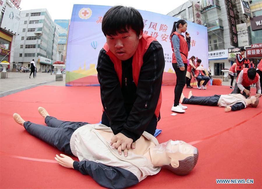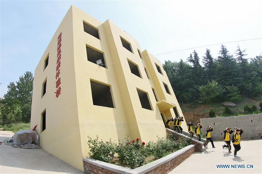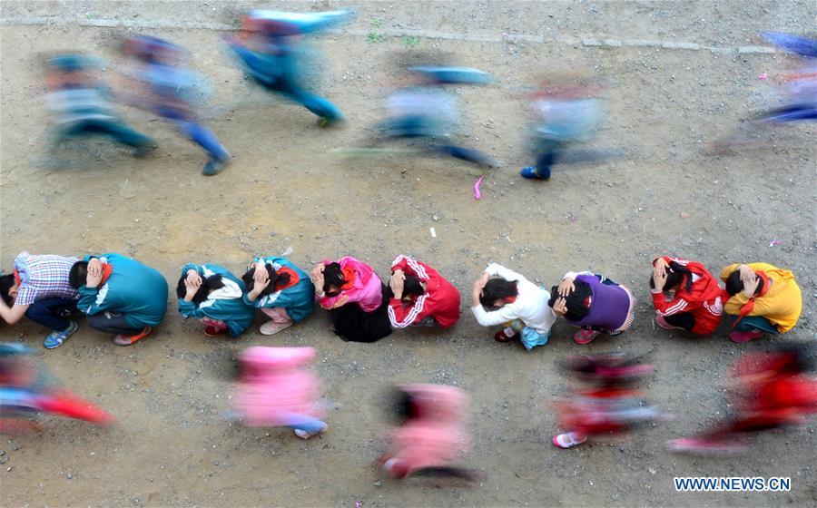 Students run out of a mock collapsed building in Yantai, east China's Shandong province, May 12, 2016. On May 12, the National Disaster Prevention and Reduction Day, various disaster emergency drills were carried out in different places in China. (Photo: Xinhua/Tang Ke)