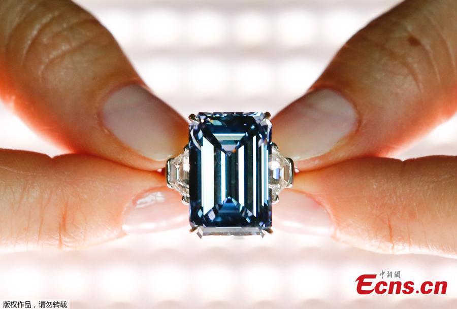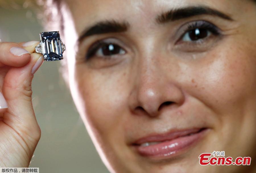 A Christie's employee poses with the 14.62 carats Oppenheimer Blue diamond during a preview in Geneva, Switzerland May 12, 2016. The largest "fancy vivid blue" diamond is estimated to sell for from US$ 38 to 45 million when auctioned during the Magnificent Jewels auction in Geneva on May 18. (Photo/Agencies)