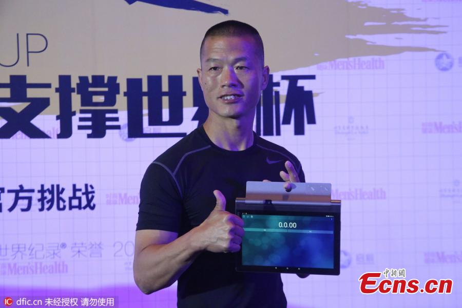 Mao Weidong, a member of the Beijing SWAT team, smashes the world record for holding the plank position - a bodyweight exercise that puts a man's core strength to the test, setting a time of eight hours and one minute in Beijing on May 14, 2016. (Photo/IC)