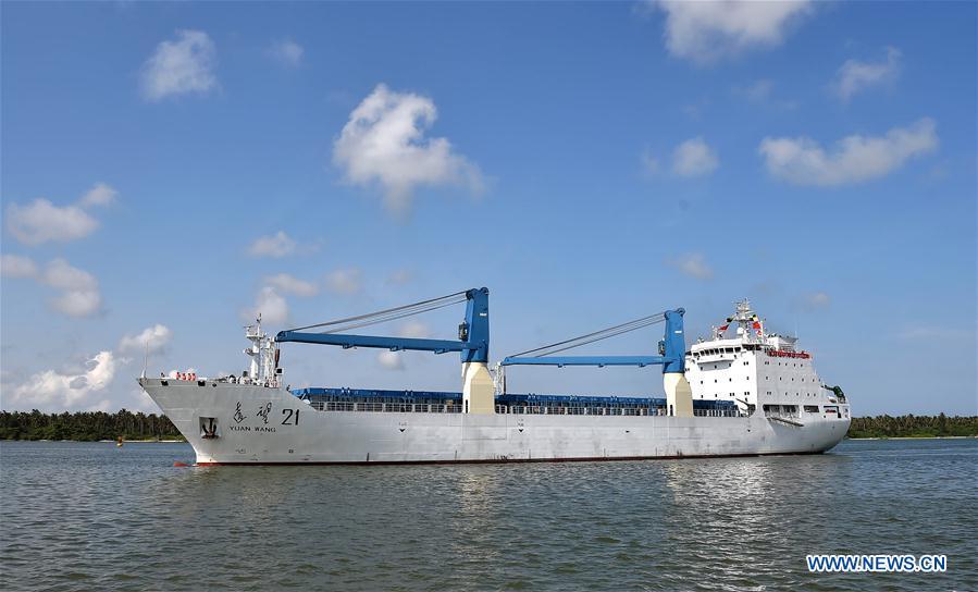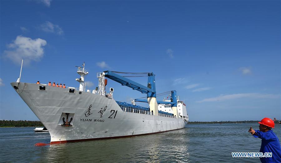 The "Yuanwang 21" transport ship carrying the Long March-7 carrier rocket arrives at Qinglan Harbor in Wenchang, south China's Hainan Province, May 14, 2016. The rocket will soon be taken to the Wenchang satellite launch center by road and test for its maiden launch late June. (Photo: Xinhua/Guocheng)
