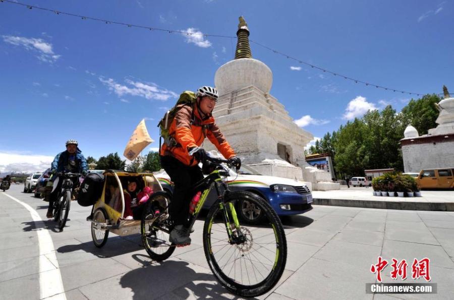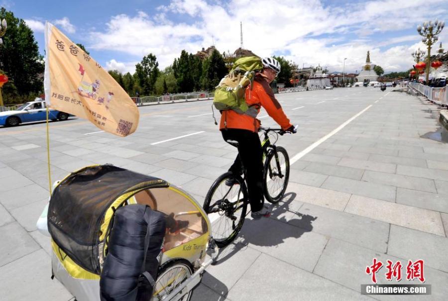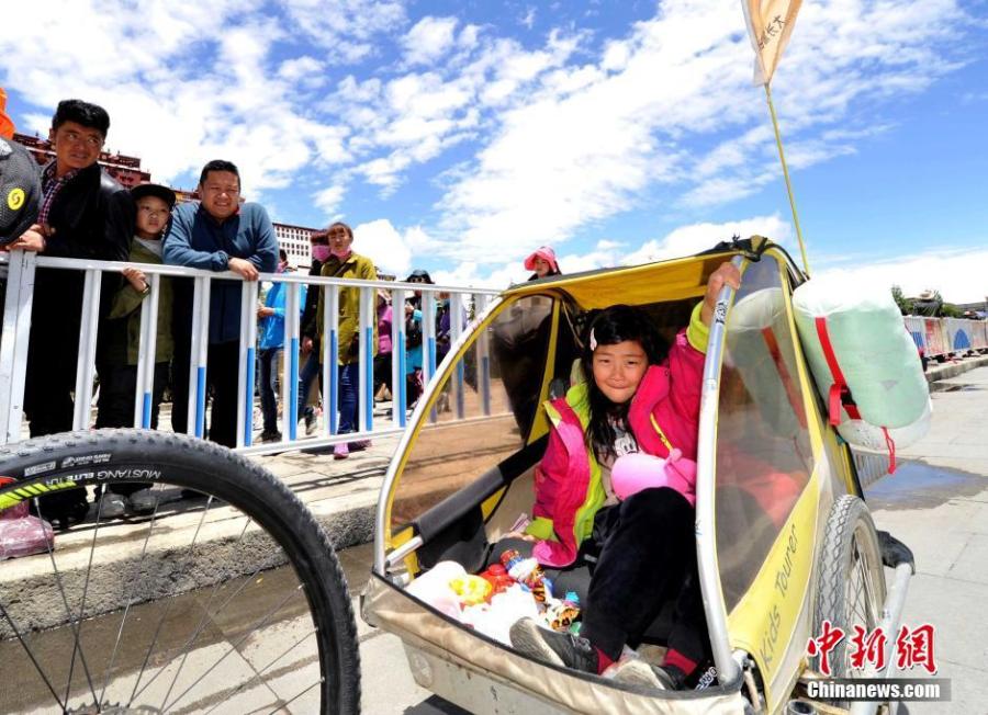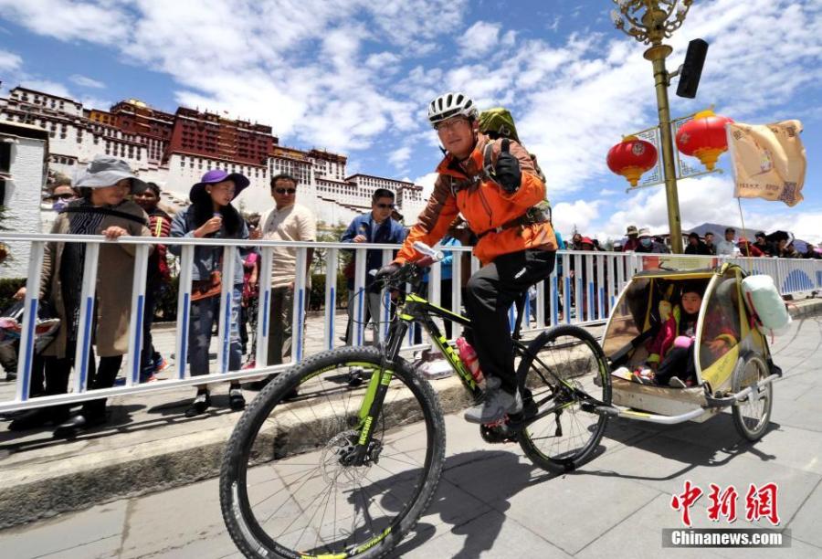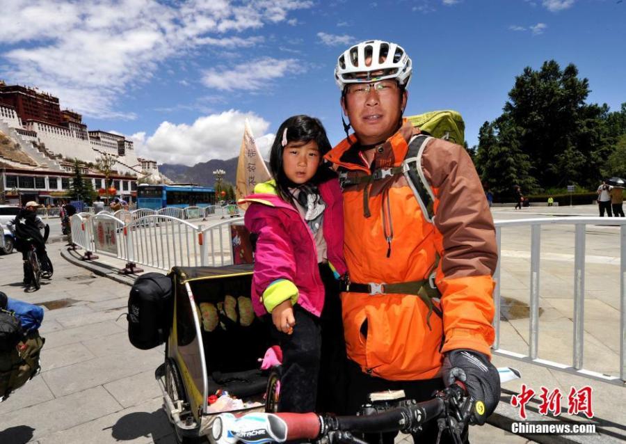 Qi Hailiang from North China's Hebei province poses a photo with his 4-year-old daughter in Lhasa, Tibet on May 14, 2016. They have cycled along the border line of China, covering 13,000 km through 10 provinces from Tangshan city last September. He made a special small carriage for his daughter and a dog, which is chained to the back wheel of his bicycle. They plan to continue the journey to Northwest China's Xinjiang Uygur autonomous region. (Photo: China News Service/Li Lin)