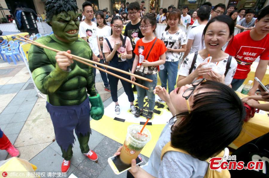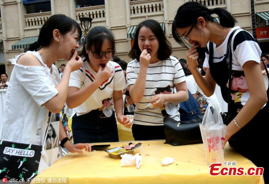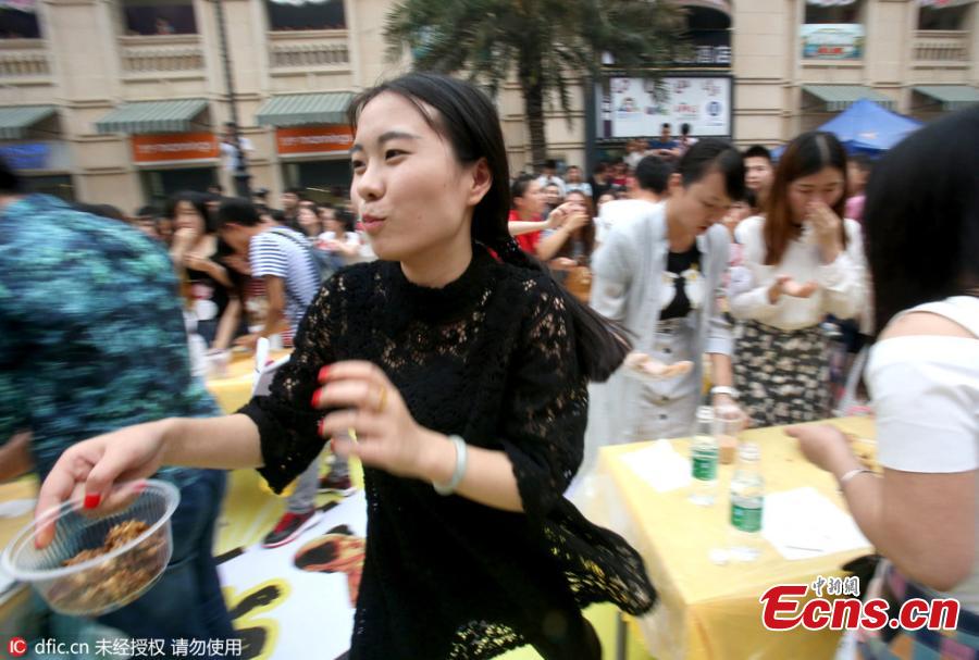 Participants gobble up duck necks during a contest in Wuhan City, the capital of Central China’s Hubei Province, May 16, 2016. According to the rules, a team of five participants was asked to finish 200g of duck necks and leave no more than 80g of bones in as short a time as possible. Wuhan duck, a spicy snack originating from the city, has become a popular snack in many cities. (Photo/IC)