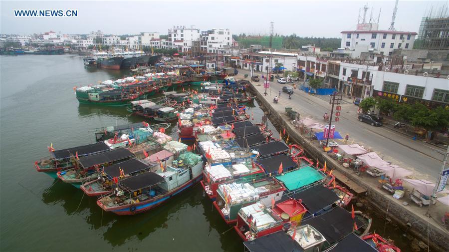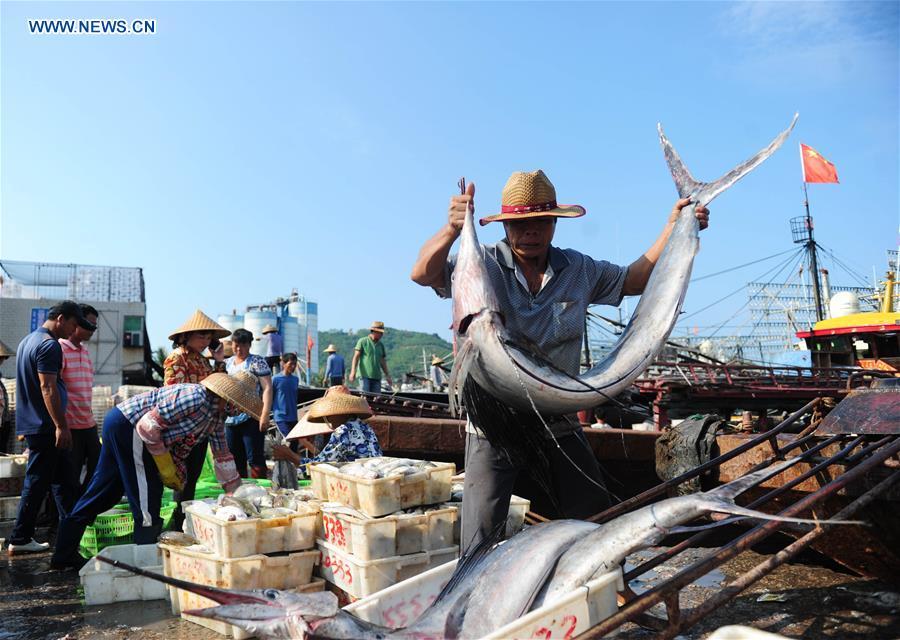 Fishermen deal with the last batch of fish goods before the moratorium at a wharf in Sanya, south China's Hainan Province, May 16, 2016. China banned fishing from May 16 to Aug. 1 in the South China Sea, a measure taken for the 18th consecutive year. (Photo: Xinhua/Sha Xiaofeng)