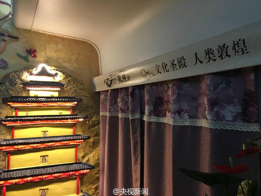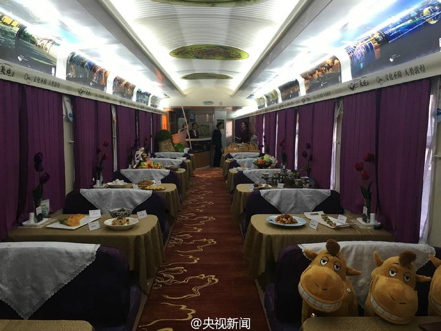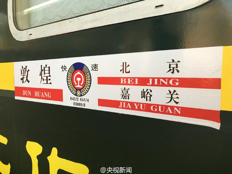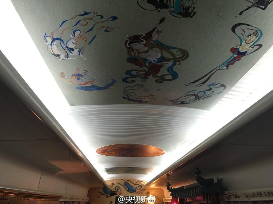 The "Dunhuang Express", starting from Gansu, has arrived in Beijing on May 14, 2016. The train is decorated with artistic patterns bringing Dunhuang culture to Beijing as well as to the 30 stops along the route. China Railway Engineering Corporation plans to put another 106 tourism expresses into operation this year. The 106 routes will all lead to the Silk Road area. (Photo/CCTV)