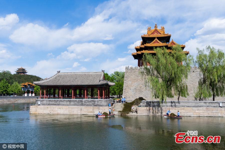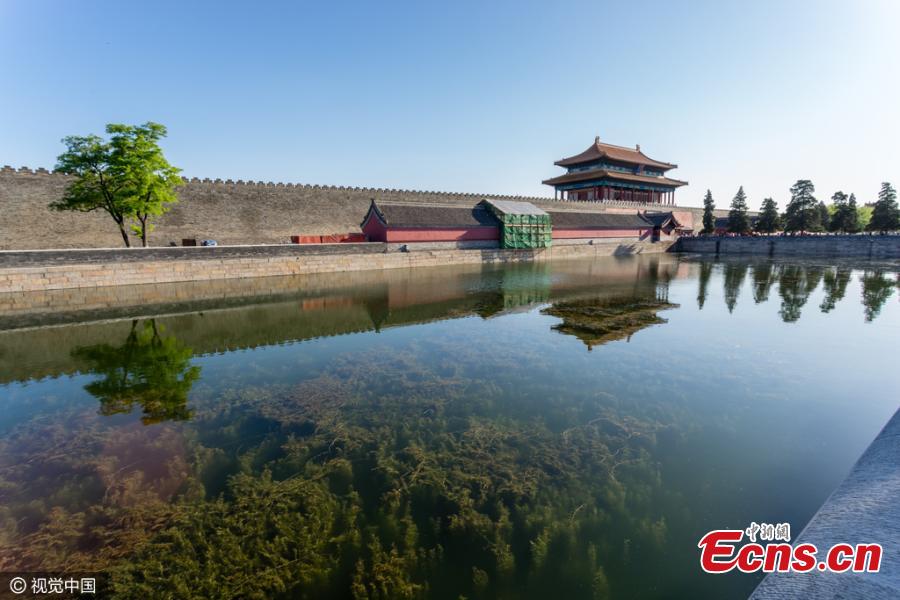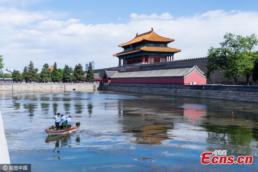 Workers clean up the moat around the Forbidden City in Beijing, May 15, 2016. The water channel around the Forbidden City’s northwestern corner tower is now clean. (Photo/CFP)