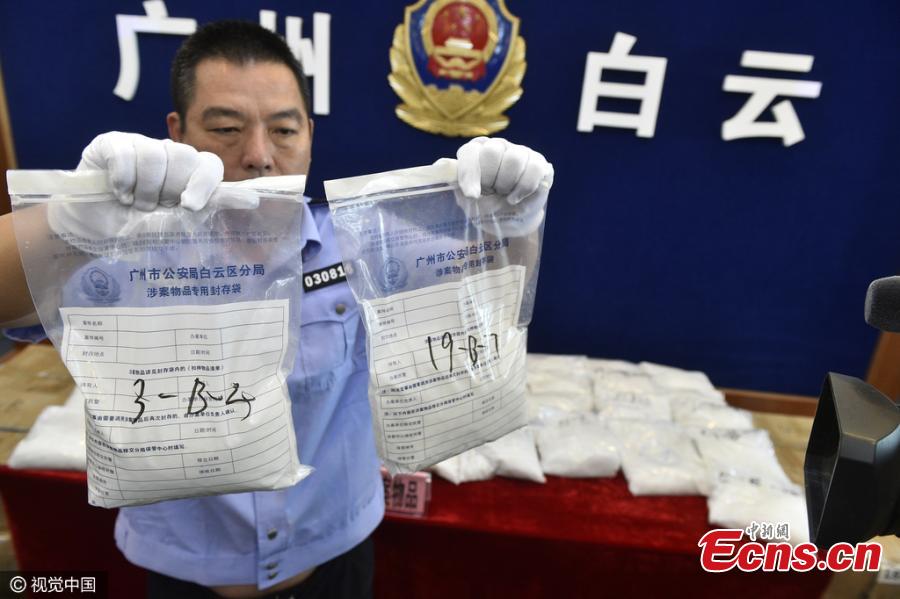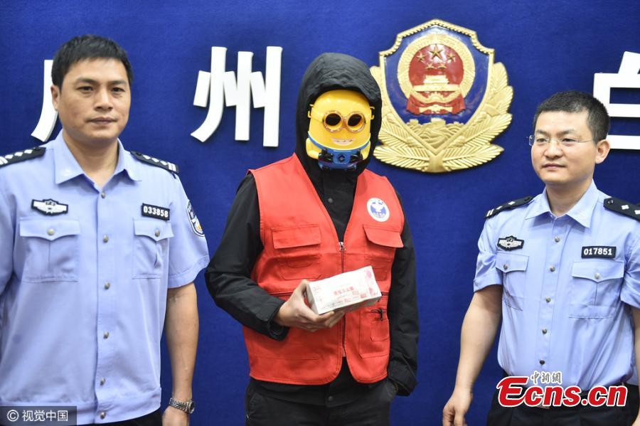 A delivery man wearing a mask to protect his identity receives a cash reward of 100,000 yuan ($15,300) from police after helping find drugs in Guangzhou City, the capital of South China’s Guangdong Province, May 18, 016. Local police said several men escaped when the delivery man insisted on a thorough inspection of their parcels. Police later found 300 kilograms of methamphetamines in 300 bags.(Photo/CFP)