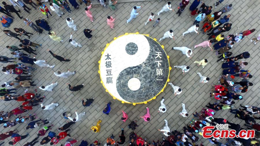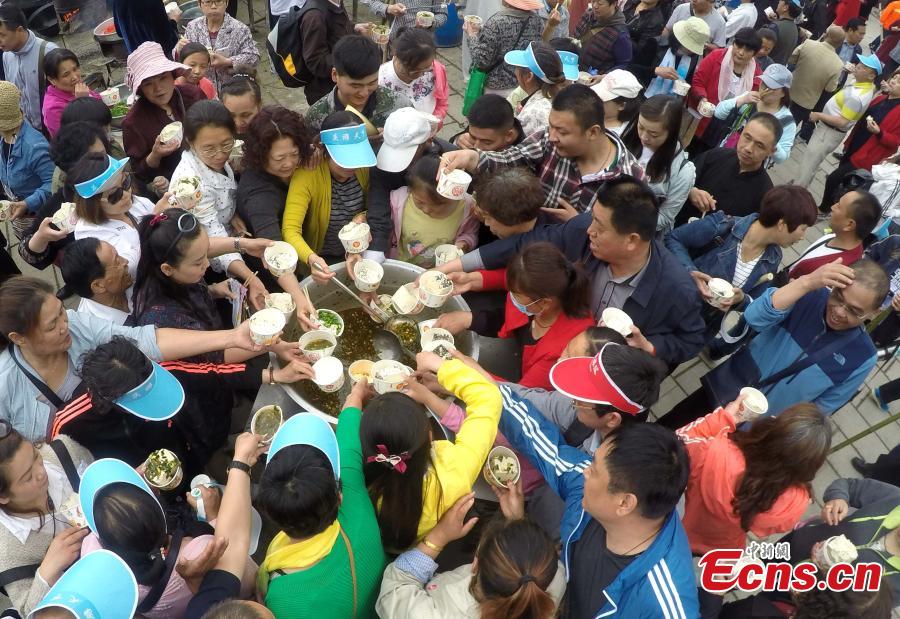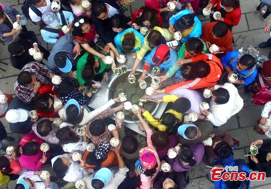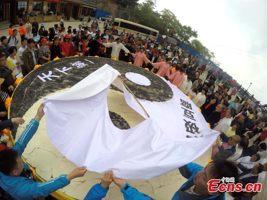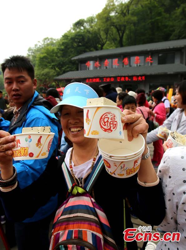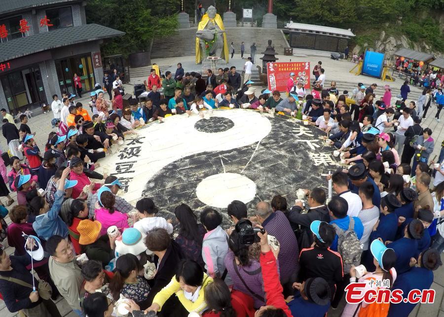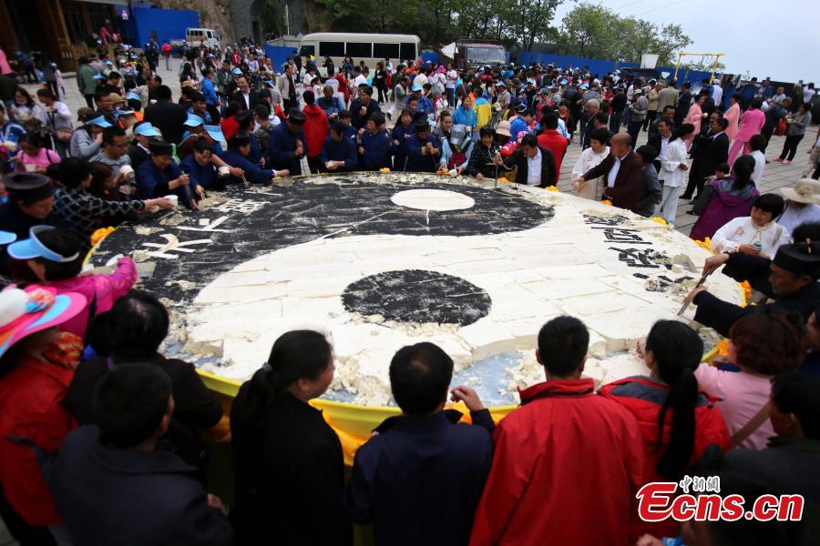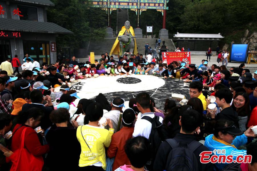 Visitors share toufu arranged in the shape of the Tai Chi "yin-yang symbol" on Laojun Mountain in Luoyang City, Central China’s Henan Province, May 22, 2016. The mountain is well-known as once being the retreat of Laozi, a great Chinese philosopher and the founder of Taoism. Made with ingredients donated by pilgrims, the food creation was five meters in diameter and weighed about 2,100 kilograms. Creators claim it is the world’s No. 1 Tai Chi toufu, which was consumed by about 5,000 visitors. (Photo: China News Service/Wang Zhongju)