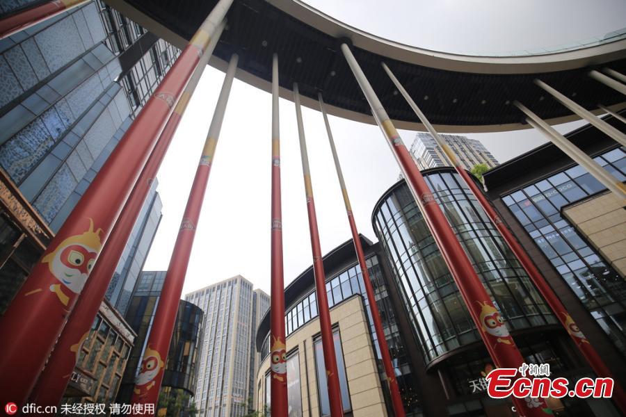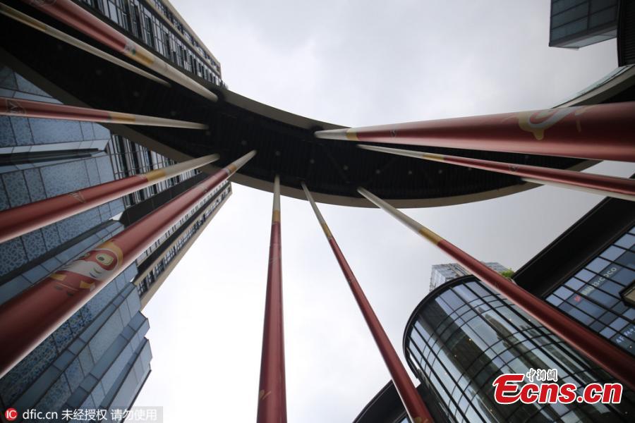 A winding flyover is supported by 18 columns in Daping, Southwest China's Chongqing Municipality, May 23, 2016. The 10-meter-high columns are decorated to resemble Jingubang, the magical weapon wielded by the Monkey King, a main character in the classic Chinese novel Journey to the West. (Photo/IC)
