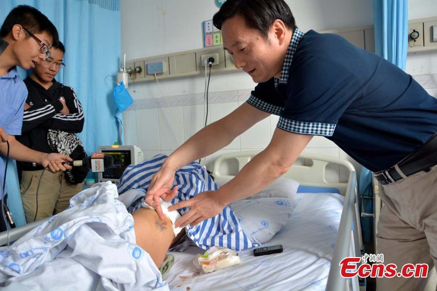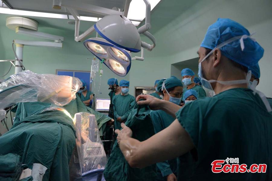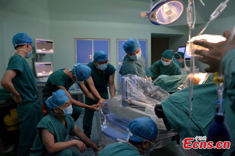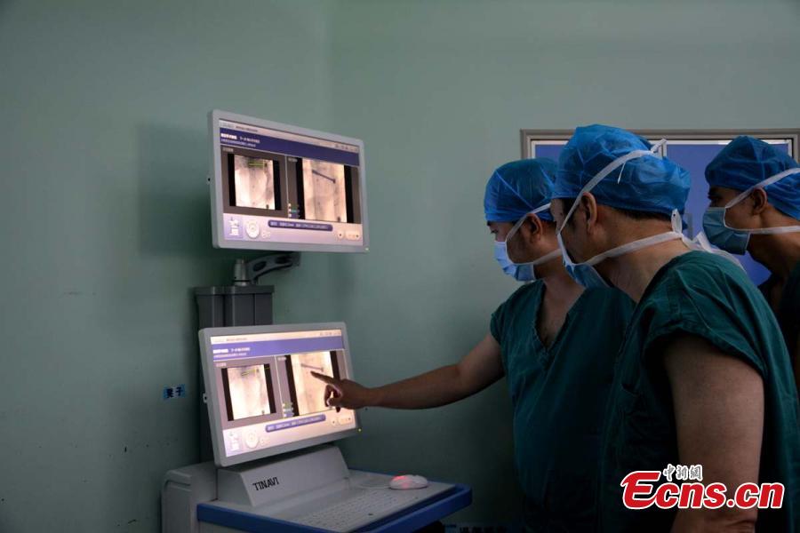 Surgeons treat a patient with pelvis conditions with the help of a robot at a hospital in Chengdu City, the capital of Southwest China’s Sichuan Province, May 24, 2016. The China-made orthopedic surgical robot system was developed through cooperation among many institutes and universities, including Chengdu University. (Photo: China News Service/Hu Min)