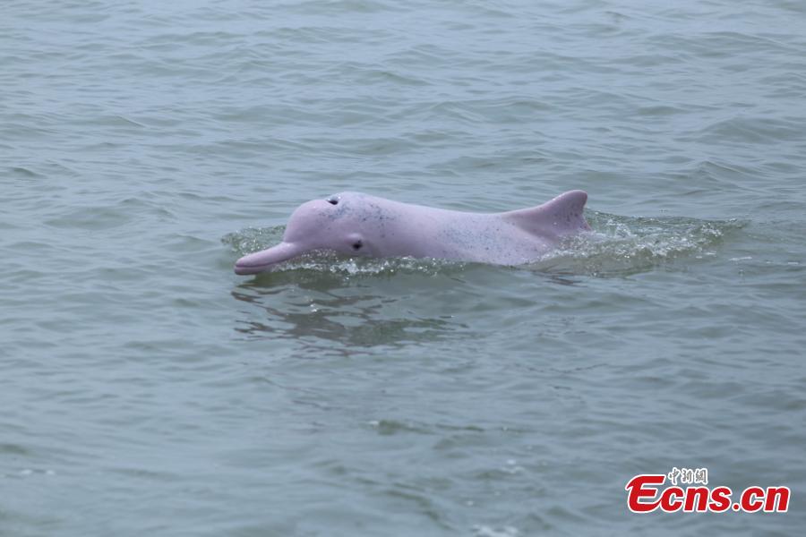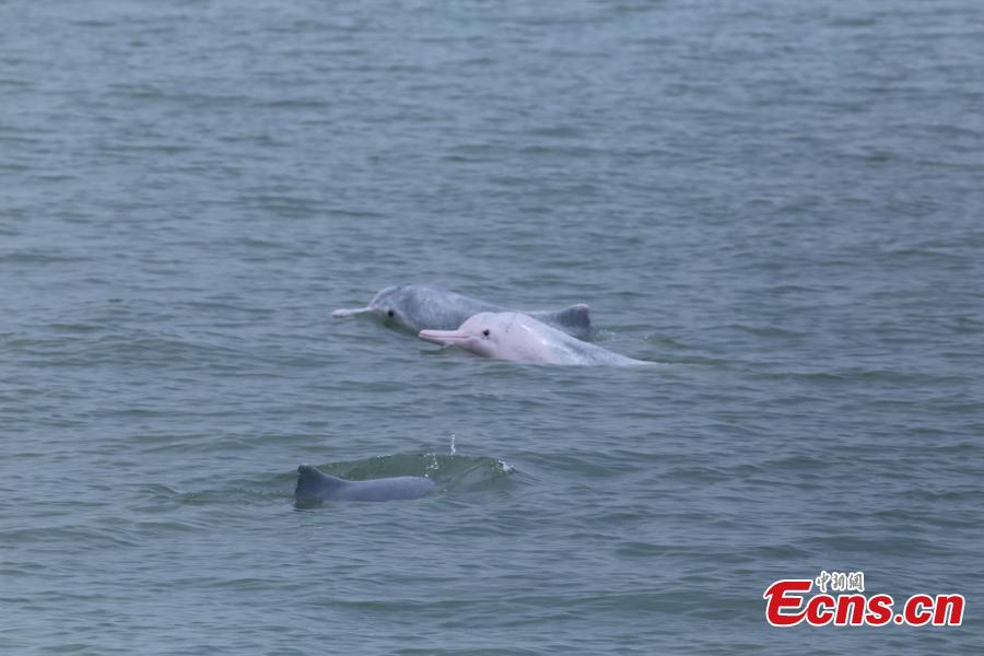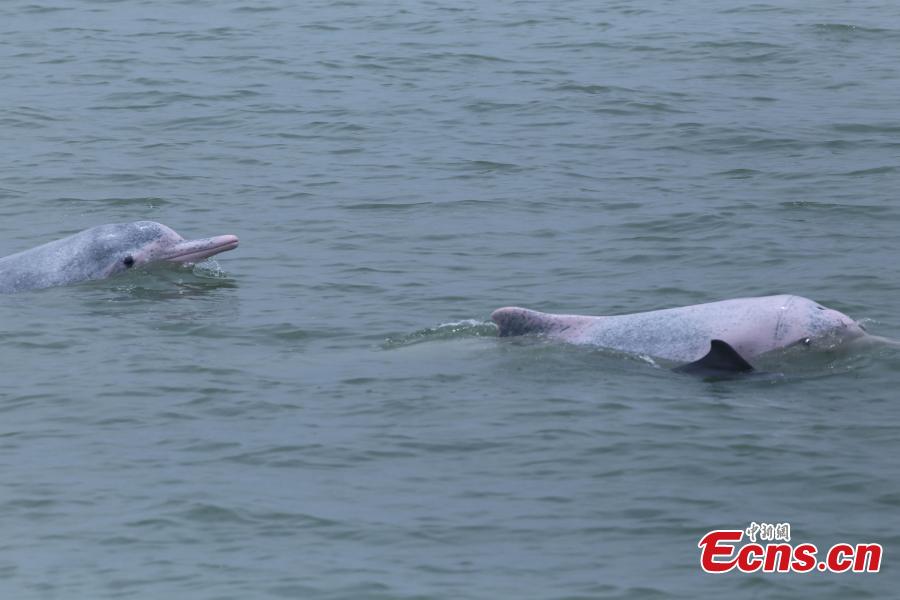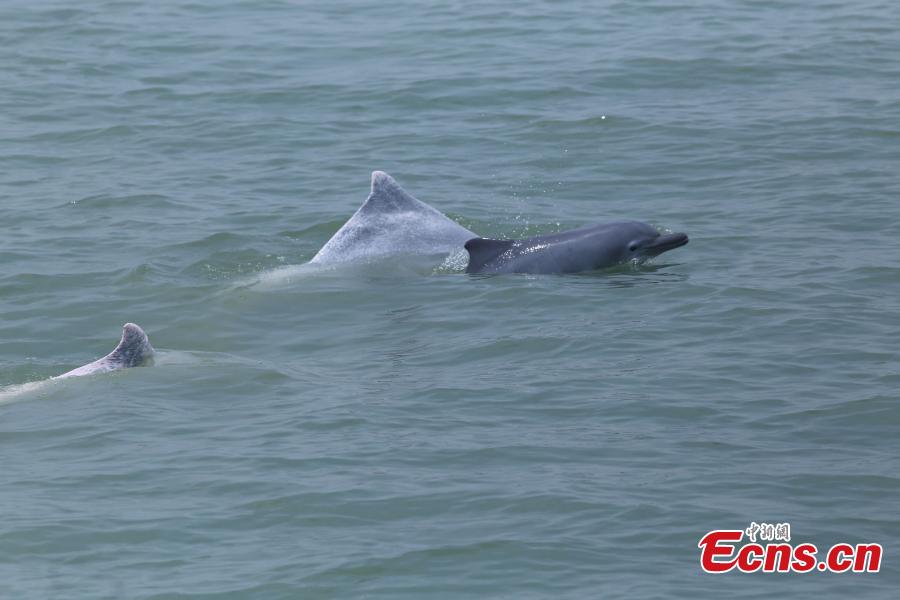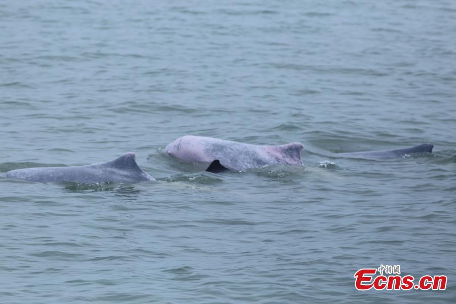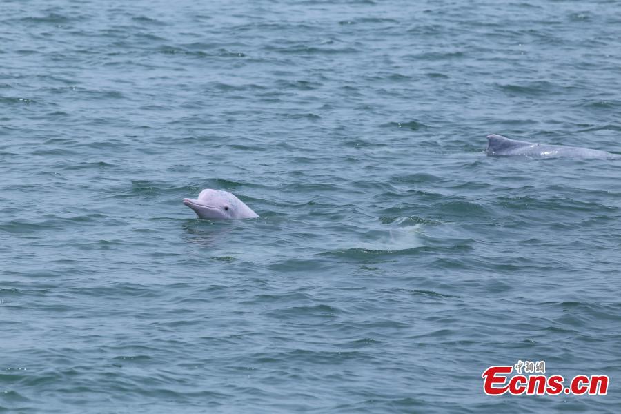 The Chinese white dolphins are spotted in Baibu Bay, South China's Guangxi Zhuang Autonomous Region, in late May, 2016. The endangered species, rarely seen in coastal areas, can now be seen in the bay following intensified efforts to protect the environment. (Photo: China News Service/Yu Hai)