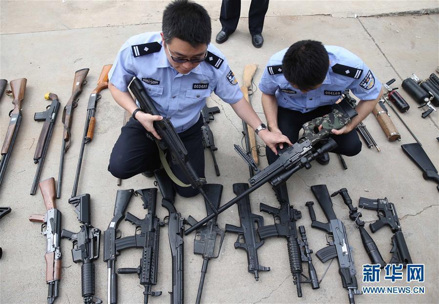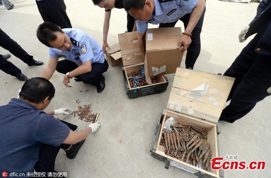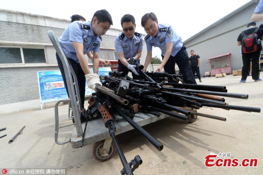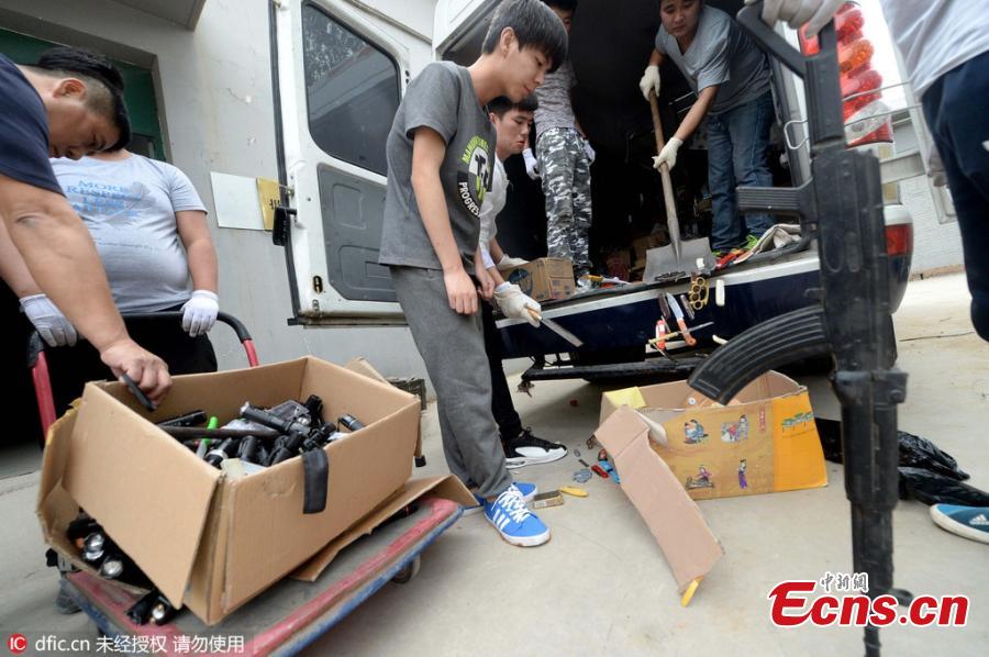 Police officers sort through confiscated guns, ammunition and controlled tools in Beijing, May 25, 2016. Beijing police seized more than 500 guns, 400 imitation guns, 60,000 bullets, 6,400 controlled knives and 30 controlled crossbows in safety campaigns this year. (Photo/IC)