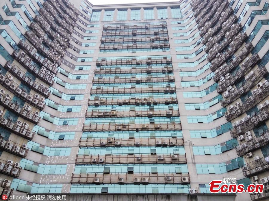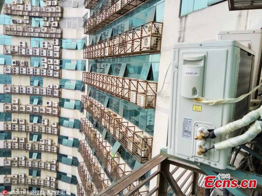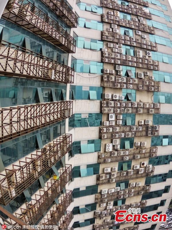 Nearly 600 air conditioning units are mounted on the walls of a 25-story building in Fuzhou City, the capital of East China’s Fujian Province, May 25, 2016. The building has no central air-conditioning system, so its walls are thickly dotted with the units, creating an unusual, eye-catching scene. (Photo/IC)