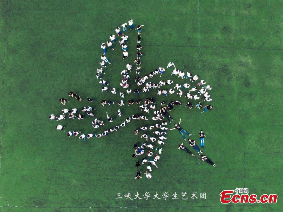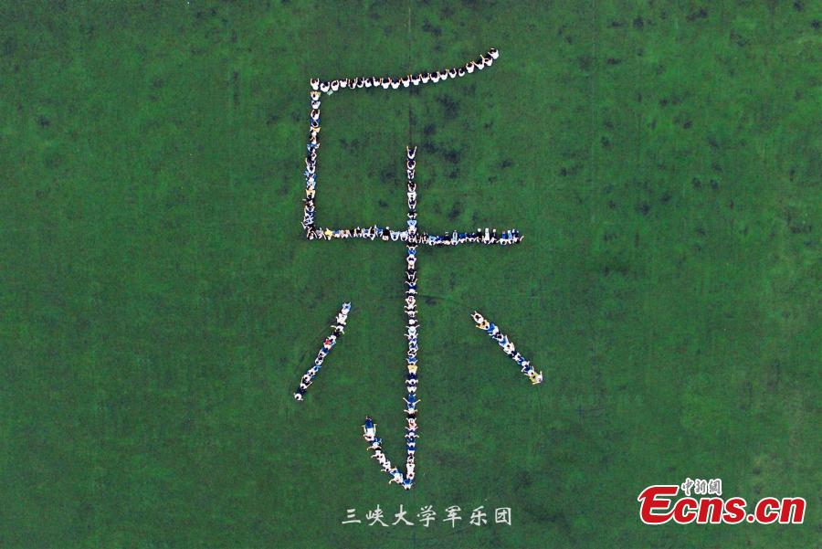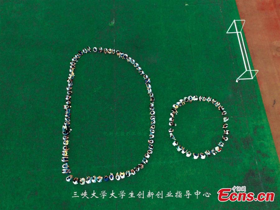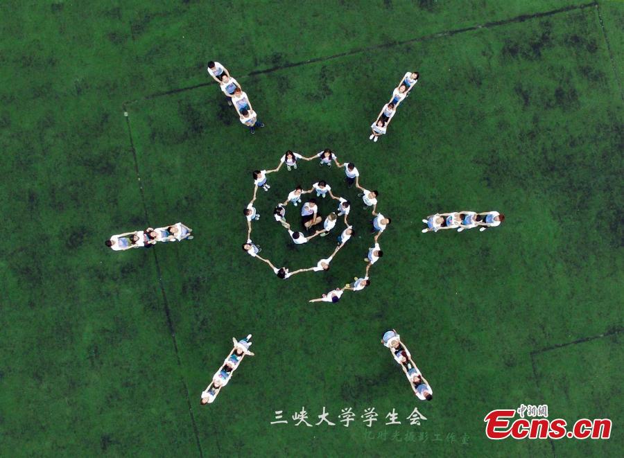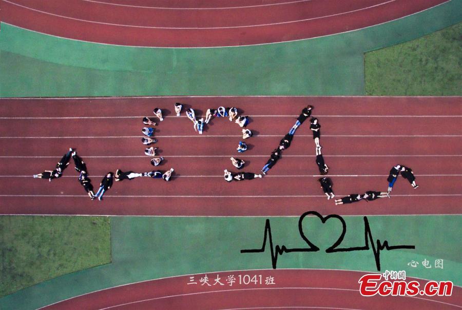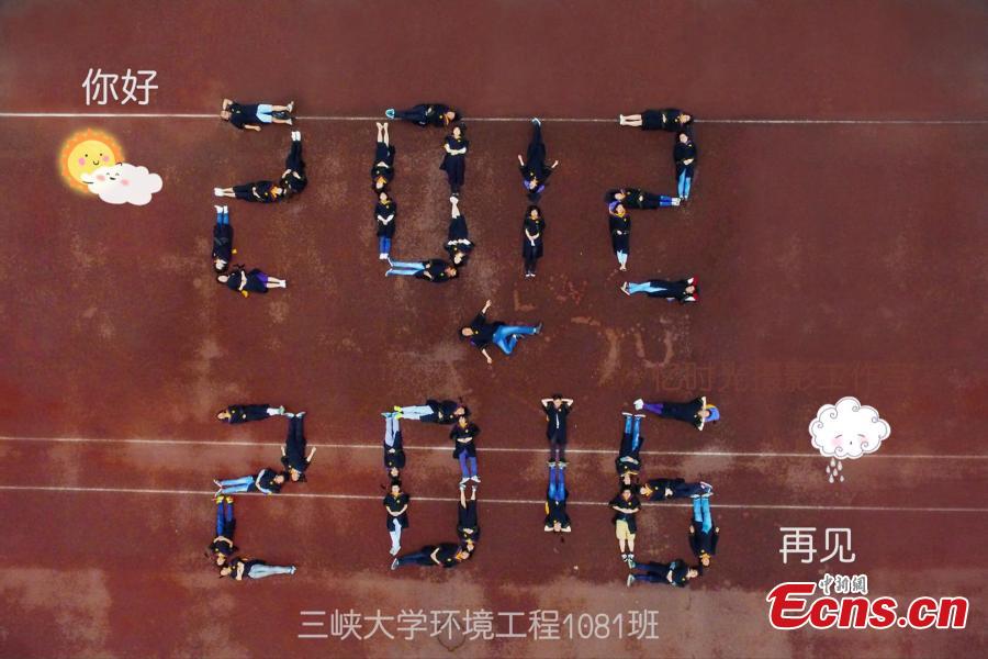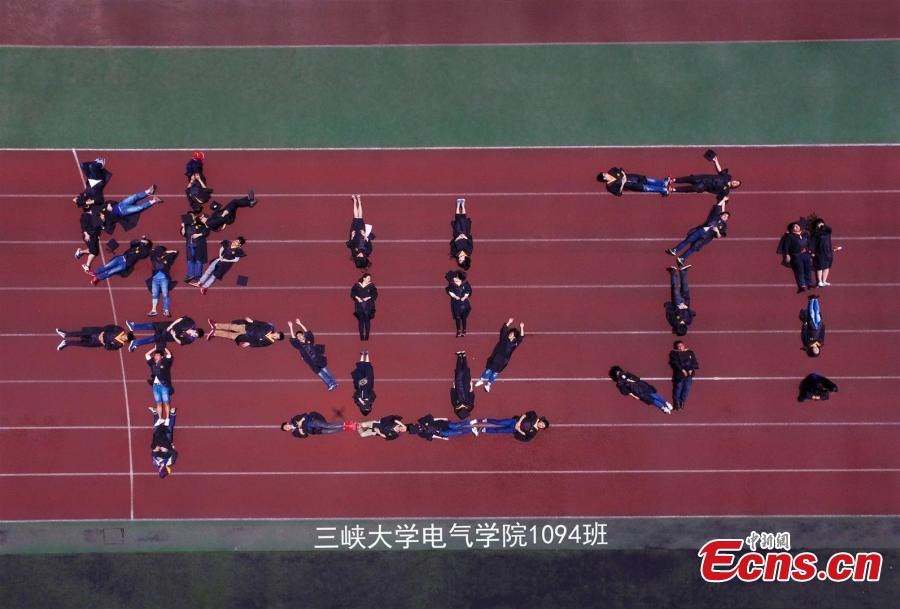Students pose for a graduation photo on the playground of China Three Gorges University in Yichang City, Central China’s Hubei Province. Students struck different poses in order to form Chinese characters, numbers and shapes for creative graduation photos. (Photo/Liu Wei)