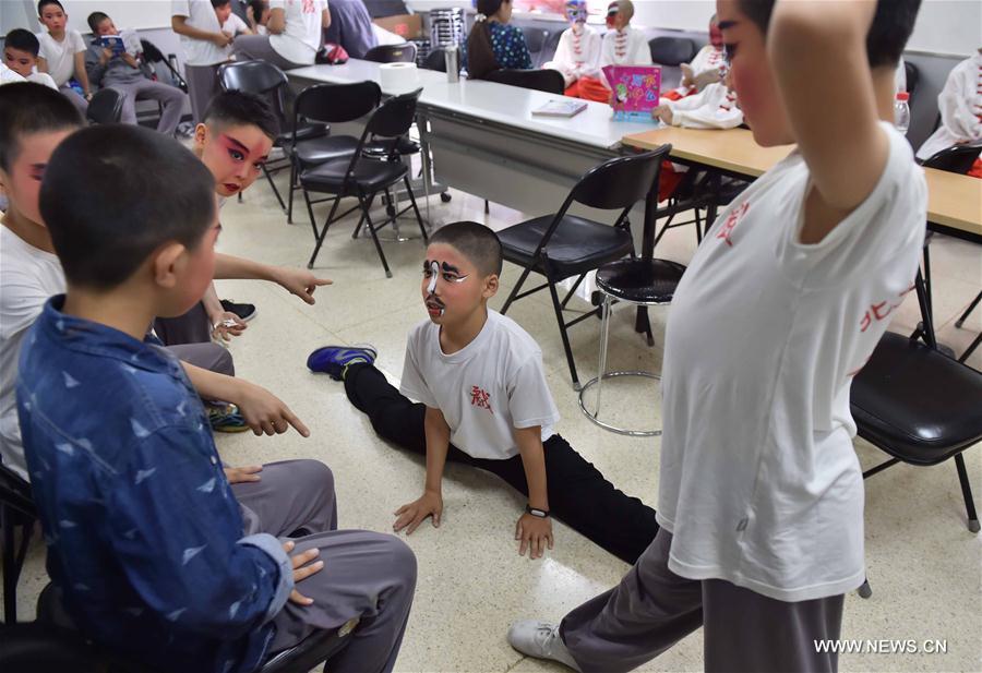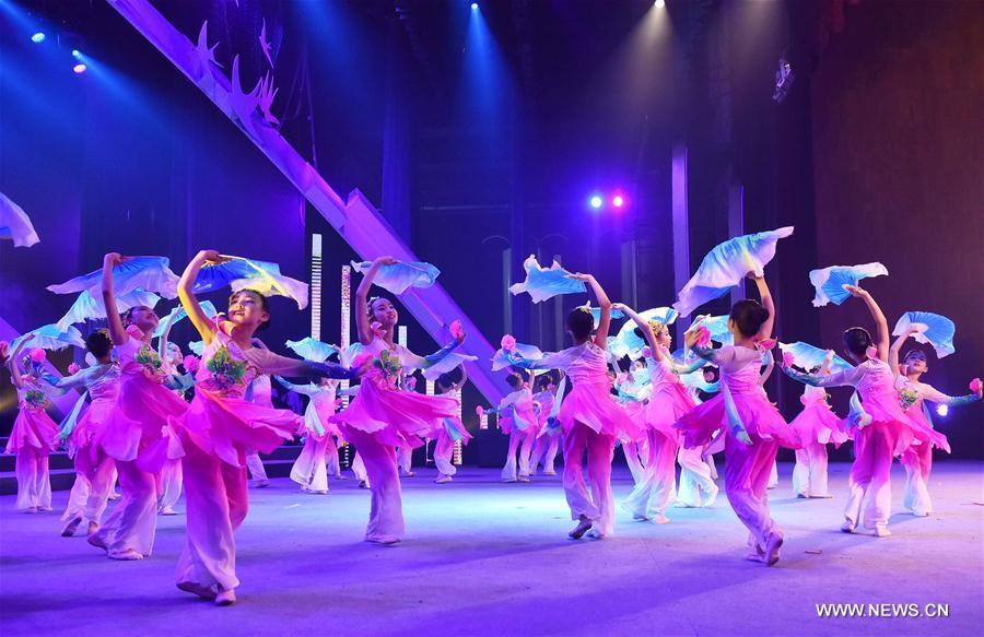 Students perform traditional dance during a performance to celebrate the upcoming International Children's Day in Beijing, capital of China, May 27, 2016. (Xinhua/Li Wen)