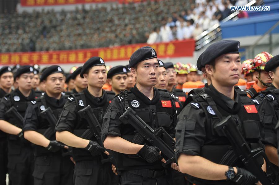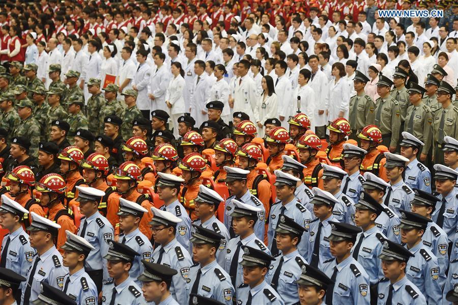 Participants attend a 100-day countdown launch event for the Group of 20 (G20) 2016 summit in Hangzhou, capital of east China's Zhejiang Province, May 27, 2016. More than 5,000 staff and volunteers preparing for the summit attended the countdown launch event in Huanglong Stadium of Hangzhou on Friday. (Xinhua/Xing Guangli)