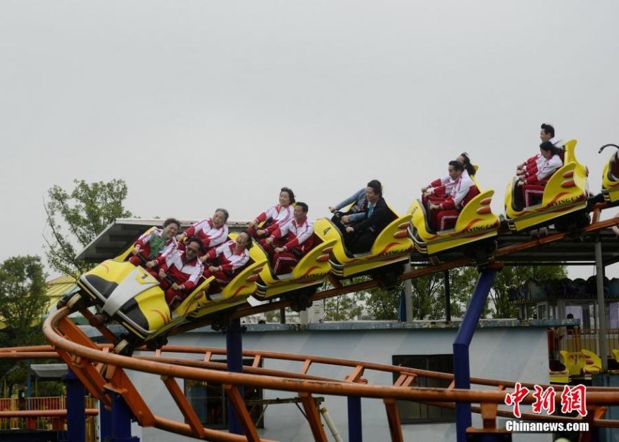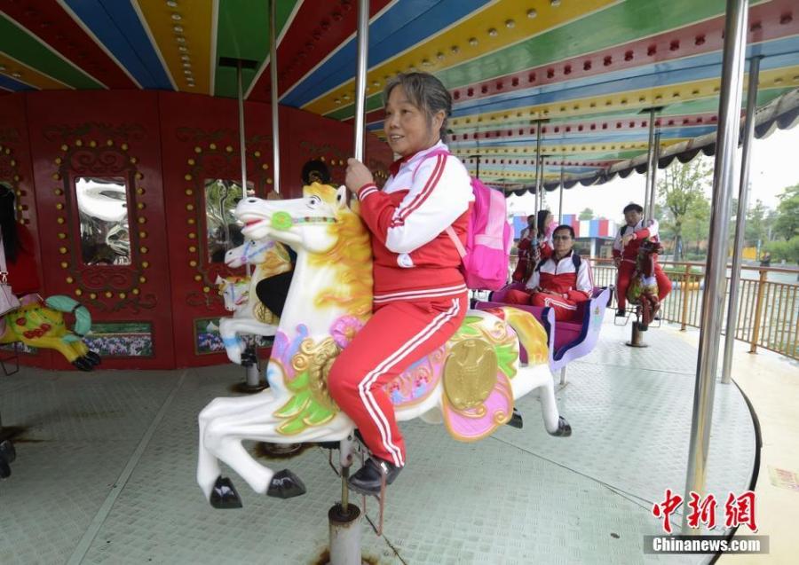 Ten tourists with an average age of nearly 60 put on school uniforms and carry school bags to visit a theme park in Changsha City, the capital of Central China’s Hunan Province, May 28, 2016, in the run-up to Children Day on June 1. Liu Zhihua, a participant, said he never played in amusement park or celebrated Children’s Day in his childhood, so he wanted to make up for that regret through the activity. (Photo: China News Service/Yang Huafeng)