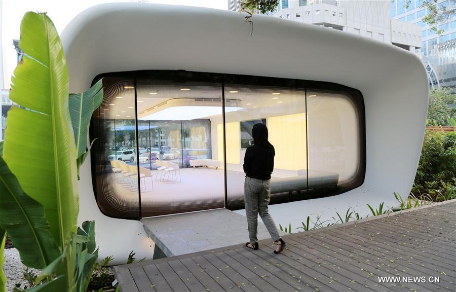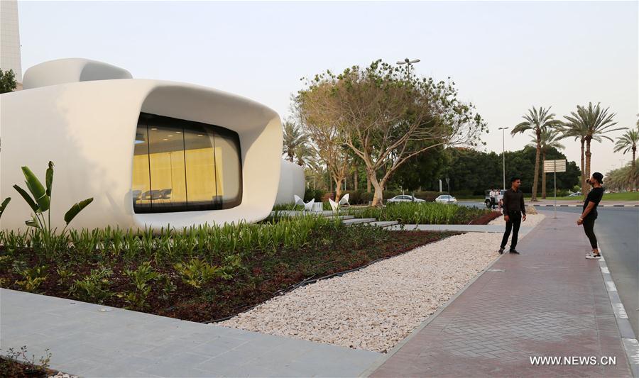 Photo taken on May 25, 2016 shows the world's first functional 3D printed building in Dubai, the United Arab Emirates (UAE). The world's first functional 3D printed building, which was inaugurated on May 23 in Dubai, is an office space covering up to 250 square metres, with its exterior design reflecting "the most innovative forms of the future workplace," according to local report. (Xinhua/Tian Wei)