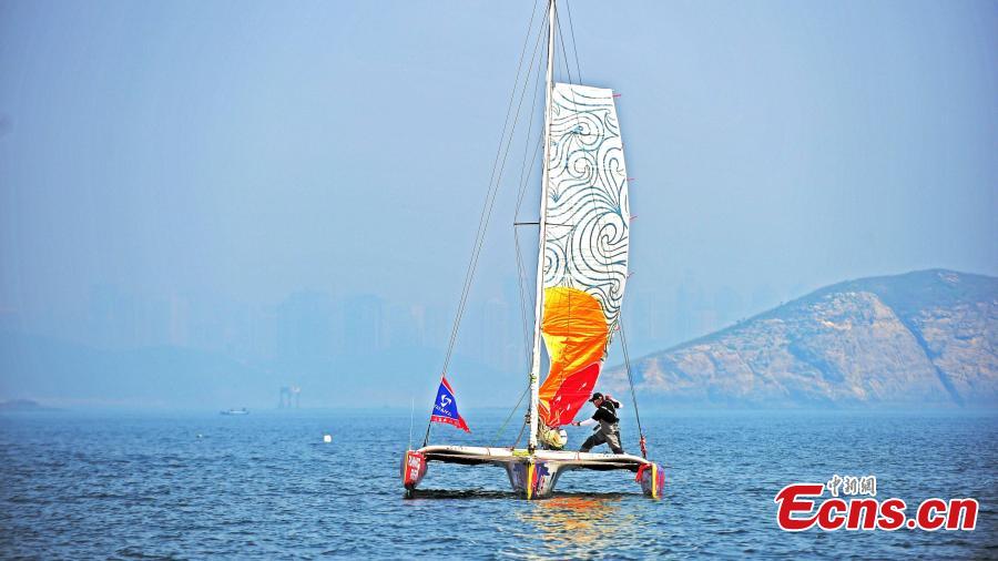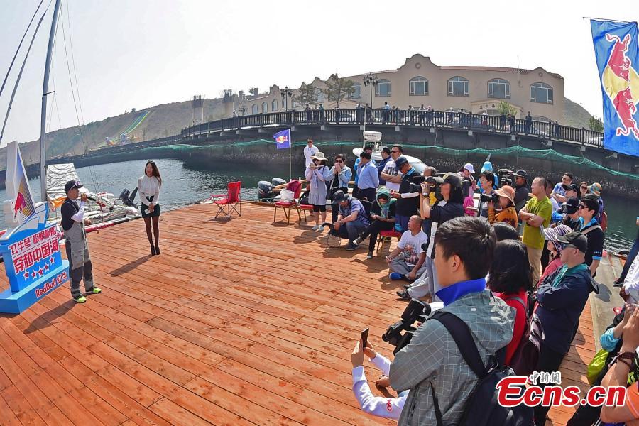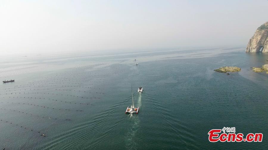 Wang Jialing sails from a port in Dalian City, Northeast China’s Liaoning Province, May 30, 2016.As a teacher at the Dalian University of Foreign Languages, the 38-year-old plans to sail a 6.72-meter-long trimaran boat to cross Chinese waters, including the Bohai, Yellow, East China and South China seas, and arrive at Sanya City in East China’s Hainan Province. He aims to finish the 4,587-kilometer-long journey on his own and without stopping for supplies during the challenge. His drinking water will be made through desalination of sea water.(Photo: China News Service/Guo Yue)