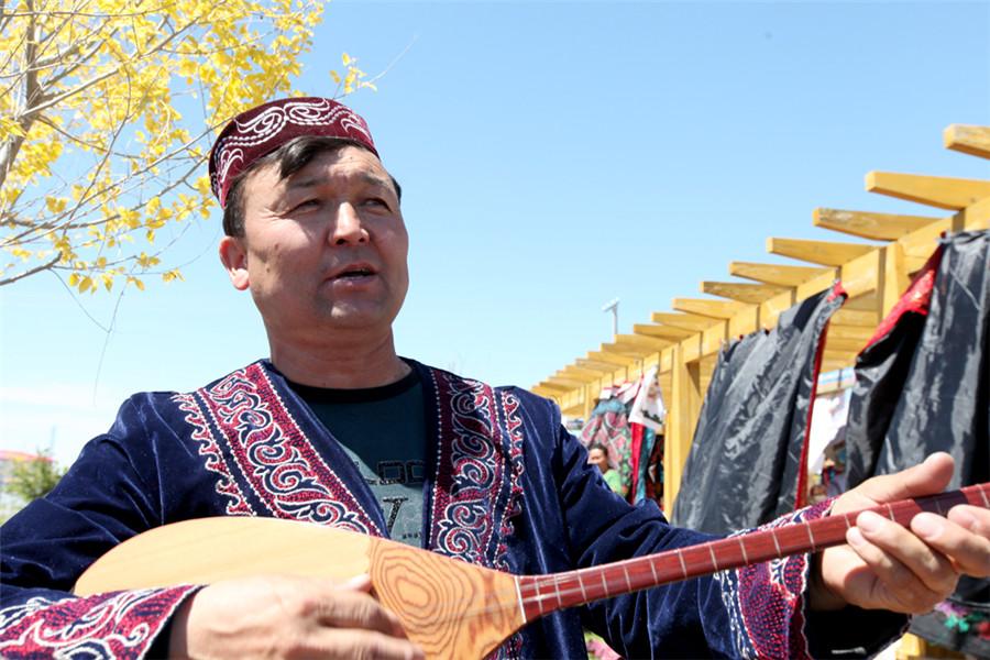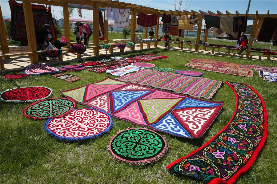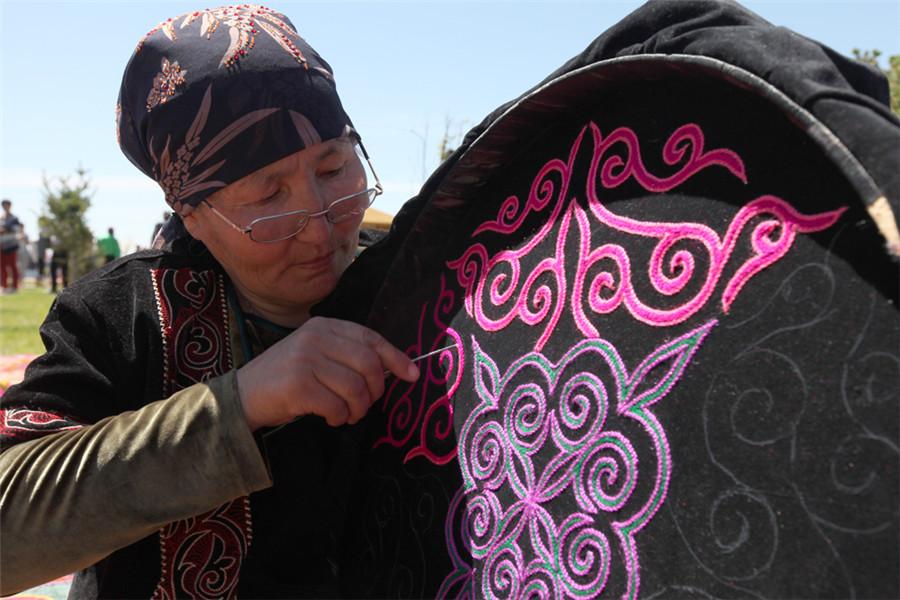 The large cultural event "Tacheng: the flower blooms" came to Emin county on Tuesday with a theme of "warm Tacheng". The event showcases traditional Kazakh handicrafts, including embroidery, saddle making, dombra (a two-stringed Kazak instrument) making and pyrograph.