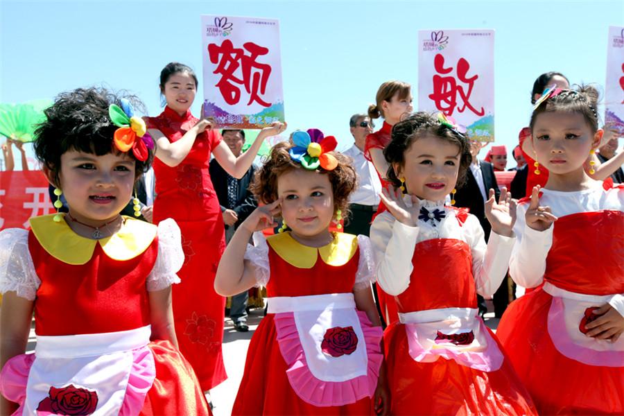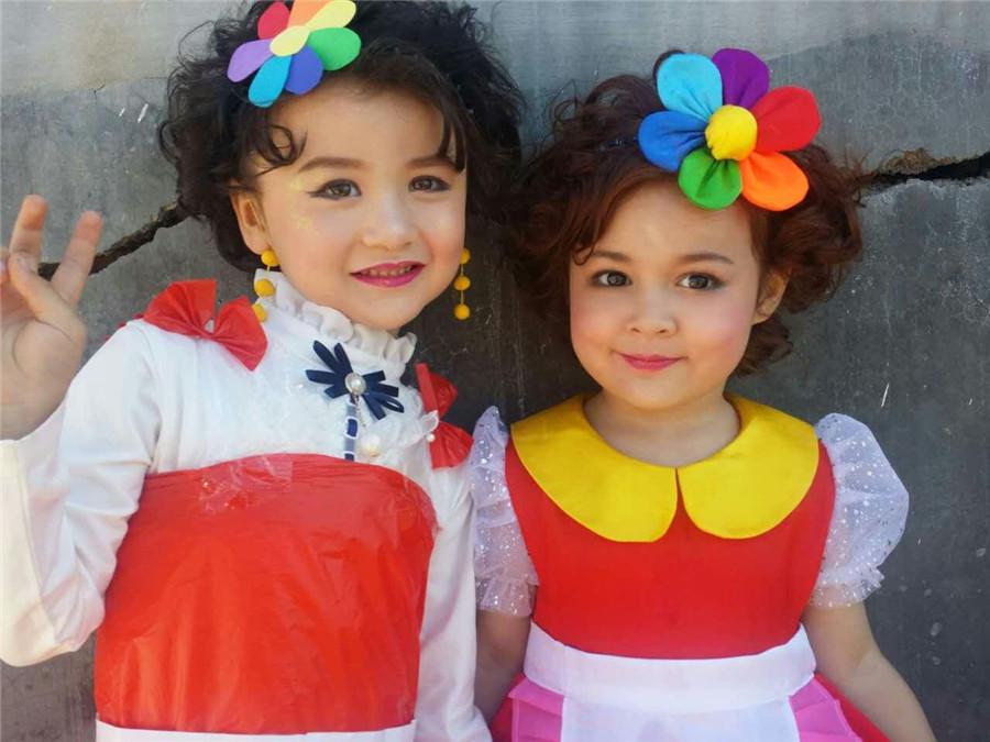 Two little girls, at the event "Tacheng: the flower blooms" pose for a photo after a performance in Emin county, Tacheng prefecture, Xinjiang Uygur autonomous region, May 26, 2016. (Photo provided to chinadaily.com.cn)