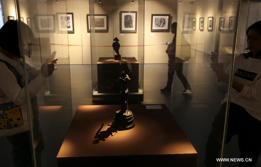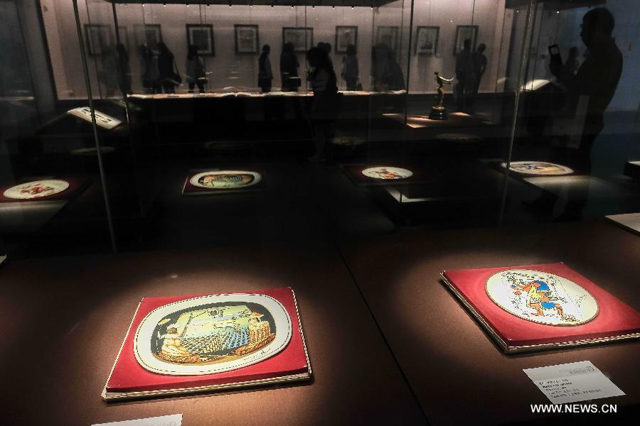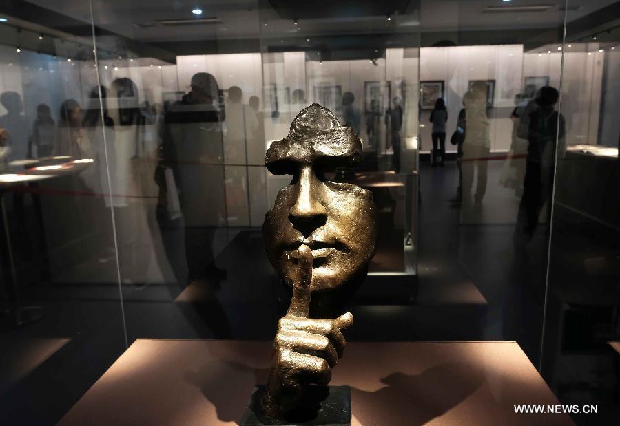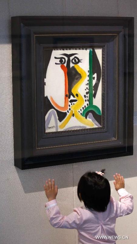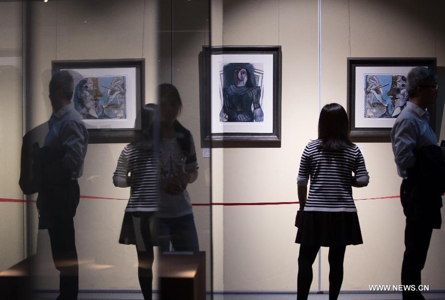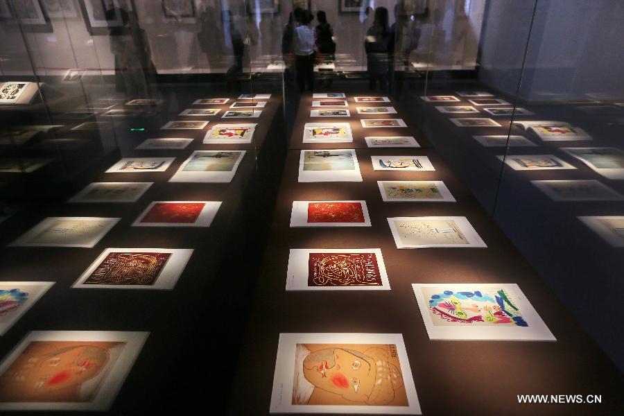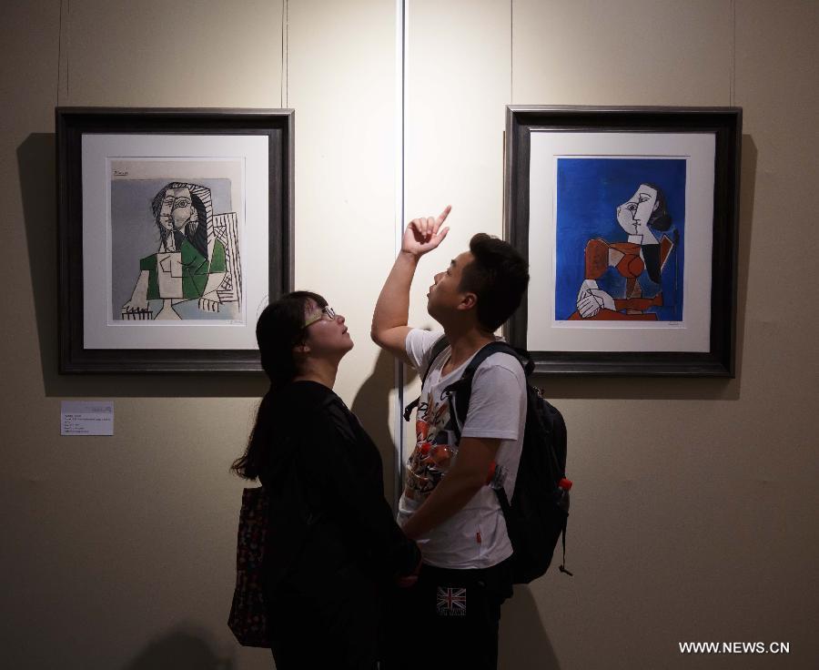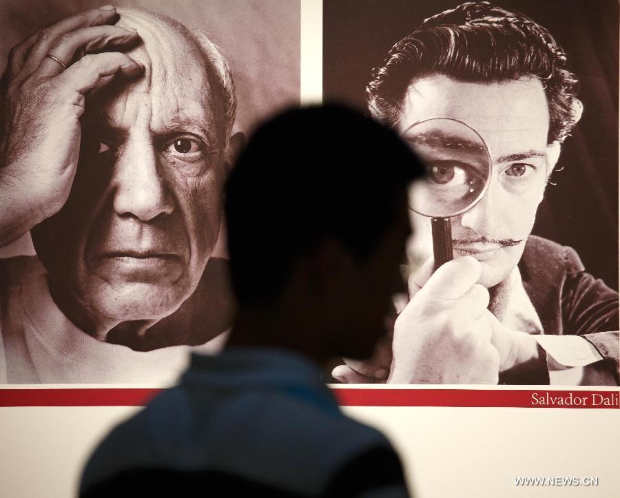 People walk past a poster at the entrance of an exhibition of Spanish artist Pablo Picasso and Salvador Dali in Nantong, east China's Jiangsu Province, May 31, 2016. A total of 86 paintings, prints, sculptures and porcelain works of Pablo Picasso and Salvador Dali were displayed at the two-month exhibition that kicked off here onTuesday. (Xinhua/Huang Zhe)